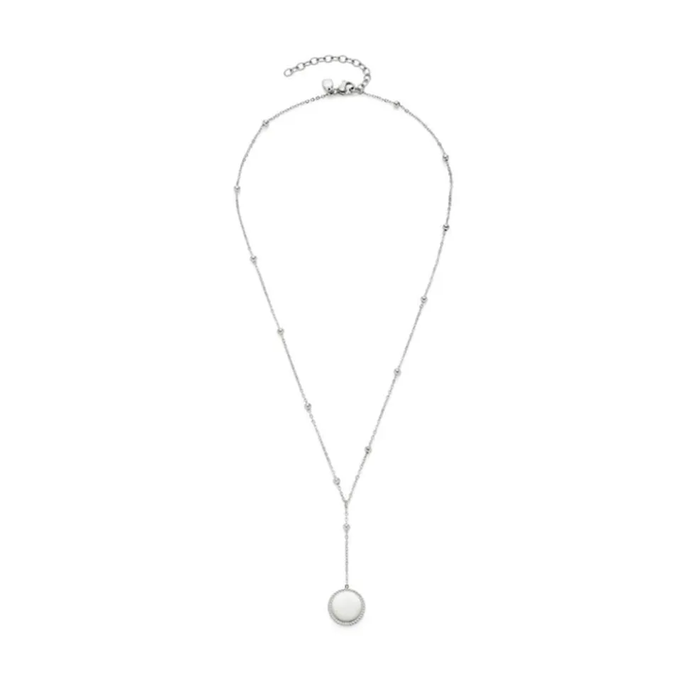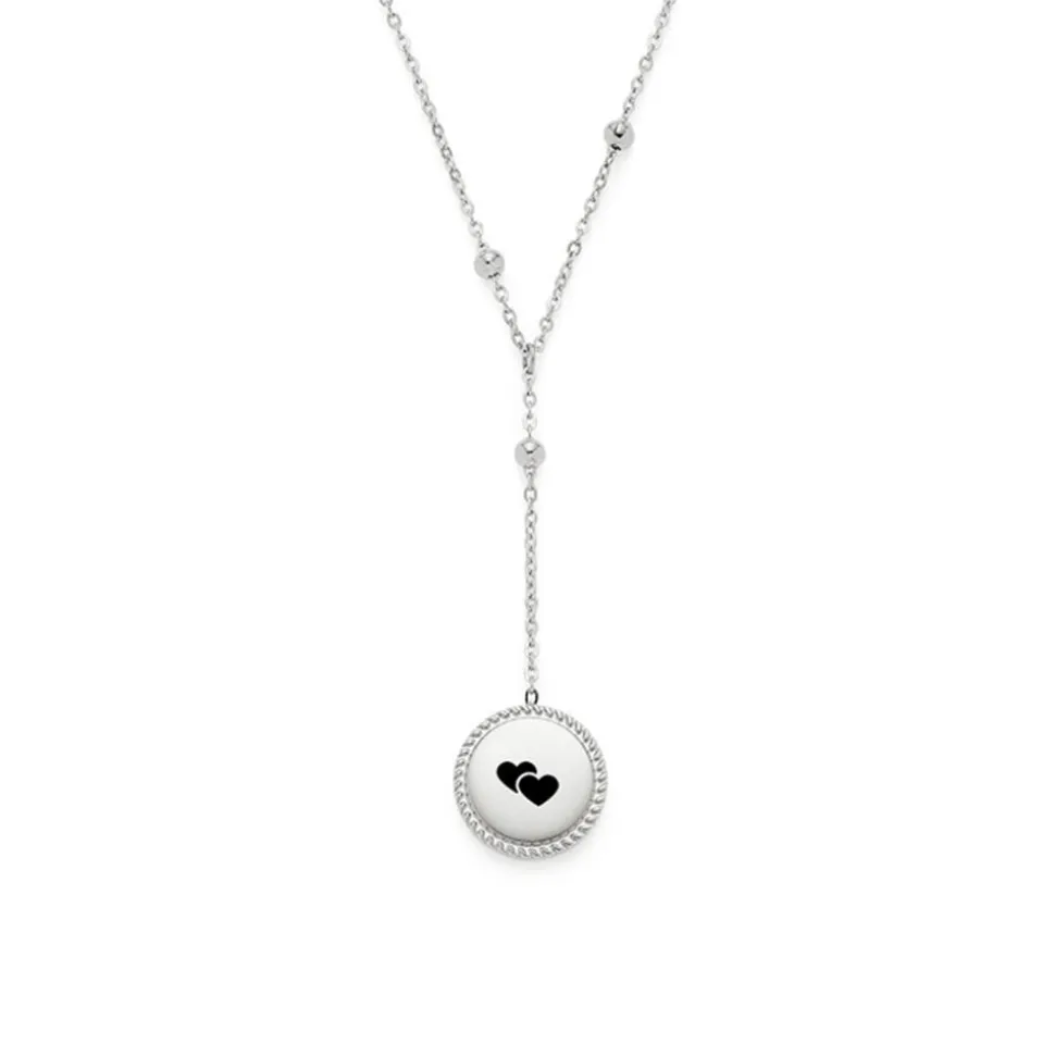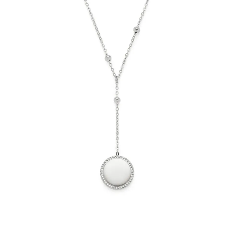 Schlichte Eleganz strahlt diese Y-Kette für Damen aus. Ihre Ankerkette ist aus Edelstahl gefertigt und besitzt zahlreiche Edelstahlkügelchen, die in regelmäßigen Abständen in die Kette integriert sind. Ein ansprechender Blickfang ist auch der Anhänger der Halskette. Er wird am Rand von einem dekorativen Muster geziert und kann beidseitig graviert werden. Die Länge der Kette kann dank des Verlängerungselements angepasst werden und verschlossen wird sie mit einem Karabiner.