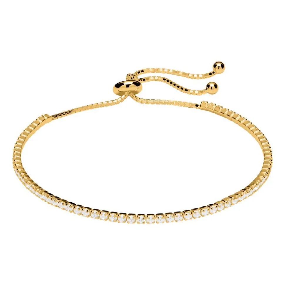 Dieses Damenarmband ist einfach formvollendet schön und wird niemals aus der Mode kommen! Der goldene Glanz des IP-beschichteten Sterlingsilbers bildet einen ansprechenden Kontrast zum weißen Funkeln der Zirkoniasteine. Durch das klassische Design passt das Armband zu zahlreichen Stilrichtungen und verleiht jedem Look eine elegante Note. Tragen Sie es entweder als alleinigen Blickfang oder aber als angesagten Layer-Look in Kombination mit weiterem Armschmuck. Durch den praktischen Zugverschluss kann die Weite des Armbandes individuell an Ihr Handgelenk angepasst werden. Zudem ist es rhodiniert und somit anlaufgeschützt.
