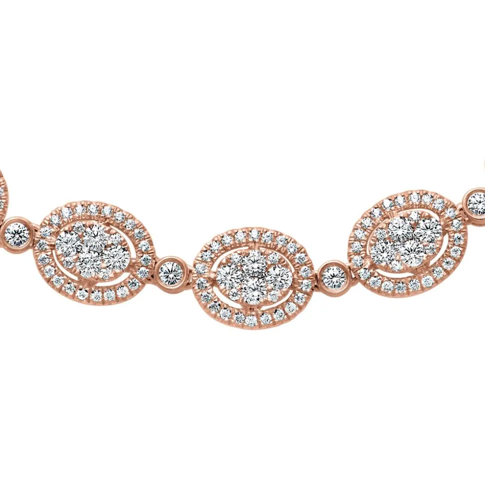 Dieses Diamantarmband für Damen ist ein wahrer Blickfang. Es besteht aus einer Reihe von ovalen Zierelementen im bezaubernden Halo-Design, die abwechselnd mit zargengefassten Diamanten angeordnet sind. Die ovalen Schmuckelemente sind in der Mitte mit jeweils vier großen und vier kleinen Diamanten besetzt, die ein funkelndes Pavé bilden und von einem Kreis kleiner Diamanten umrahmt werden. Insgesamt strahlen 495 Diamanten auf diesem glamourösen Armband. Die Diamanten im Brillantschliff haben zusammen ein Gewicht von etwa 2,81 ct. und verfügen über die Farbe „Feines Weiß“ (Top Wesselton) sowie die Reinheit SI (small inclusions). Da wir zudem auch Wert auf ethische Aspekte legen, stammen unsere Diamanten alle aus konfliktfreien Bezugsquellen. Da das Armband in verschiedenen Legierungen verfügbar ist (585er oder 750er Roségold), kann die gewünschte Legierung über das Drop-down-Feld ausgesucht werden. Um einen guten Halt am Handgelenk zu gewährleisten, ist das Armband mit einem Sicherheitsverschluss versehen. Dieser ist im gleichen Stil gehalten und reiht sich daher perfekt ein.