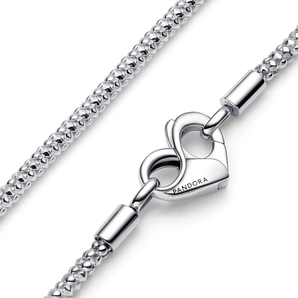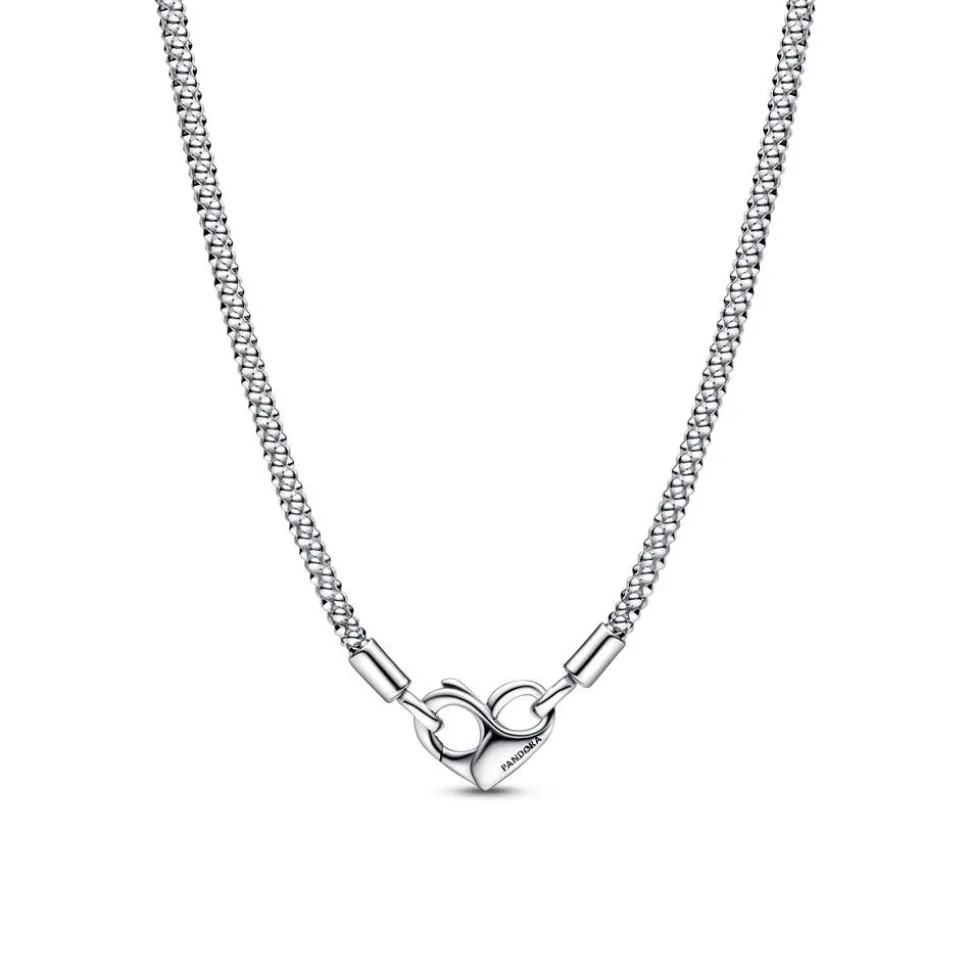 Für einen lässig-romantischen Look sorgt diese Halskette aus Sterlingsilber. Die Kette für Damen besitzt eine fantasievolle Struktur und einen herzförmigen Karabinerverschluss mit Infinity-Zeichen. Um der Kette noch mehr Individualität zu verleihen, kannst Du sie mit jedem Pandora Moments O-Anhänger oder einem herzförmigen Charm-Anhänger stylen.