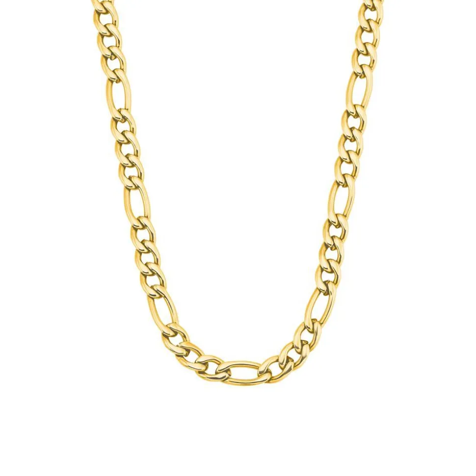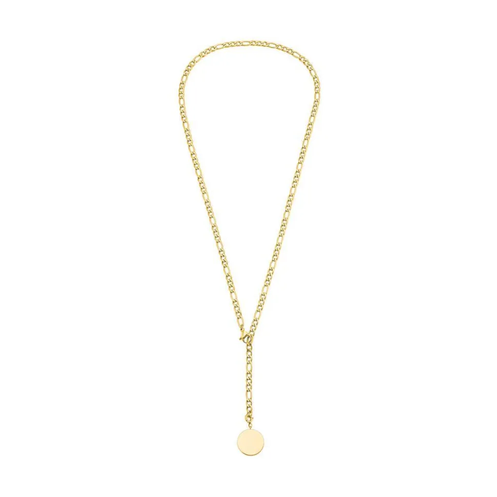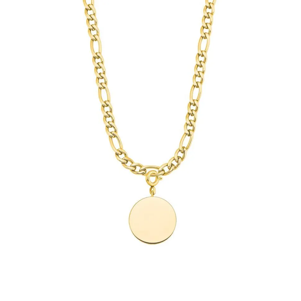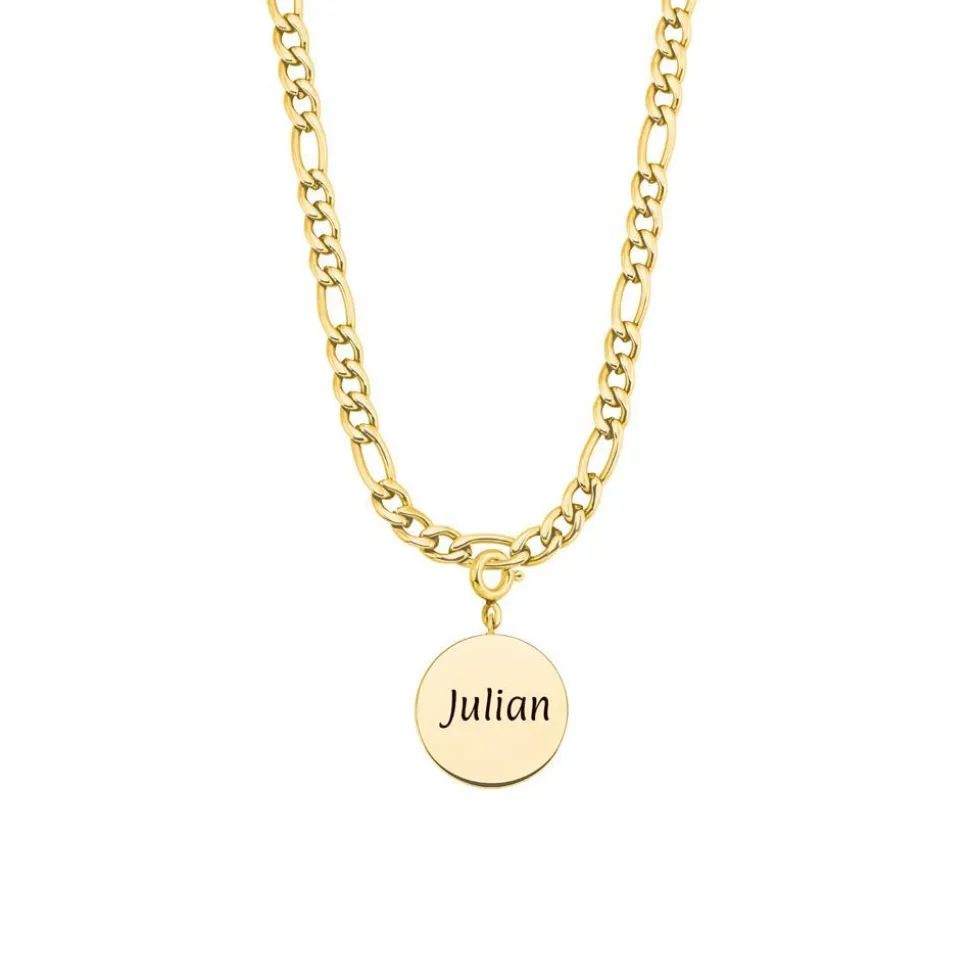 Klassisch und modern zugleich – das ist diese Figarokette für Damen! Sie ist aus Edelstahl gefertigt, welcher mit einer goldfarbenen IP-Beschichtung versehen ist. Der runde Anhänger kann auf beiden Seiten mit einer Wunschgravur versehen werden. Die Kette kann auch als Y-Kette getragen werden: Dafür den Karabiner einfach nur in ein beliebiges Kettenglied einhaken.