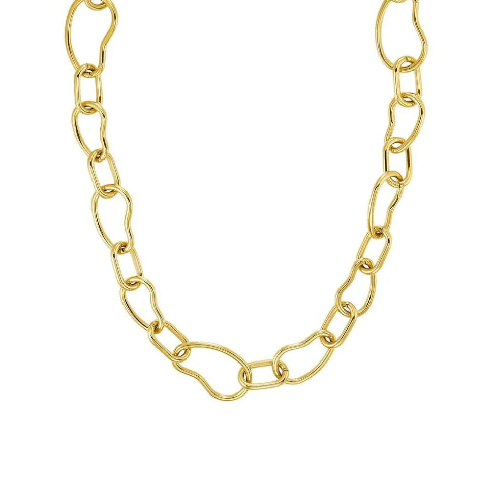 Große organisch-geformte Ankerkettenglieder machen den coolen Charme dieser Halskette aus. Sie ist aus Edelstahl gefertigt und mit einer goldfarbenen Ionenplattierung versehen. Durch den großen Federringverschluss kann die Länge der Kette zudem beliebig angepasst werden.