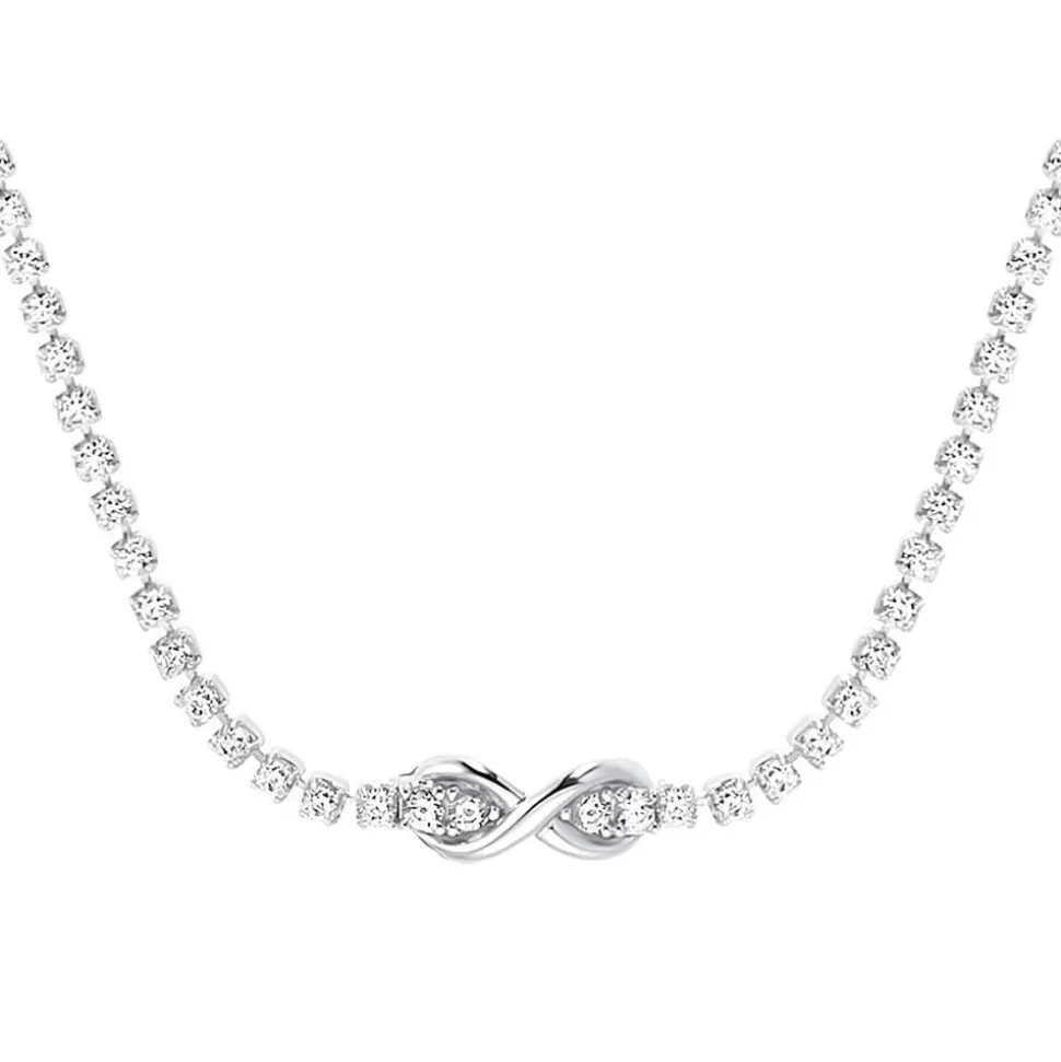 Dieses Collier für Damen besticht mit seinem traumhaften Design. Es ist aus 925er Silber und funkelnden Zirkoniasteinen gefertigt. Im vorderen Bereich der Kette befindet sich ein eingearbeitetes Unendlichkeitszeichen. Eine Beschichtung aus Rhodium schützt das Schmuckstück vor dem Anlaufen. Dank des Verlängerungselements kann die Länge individuell angepasst werden und der Karabinerverschluss sorgt für einen guten Halt.
