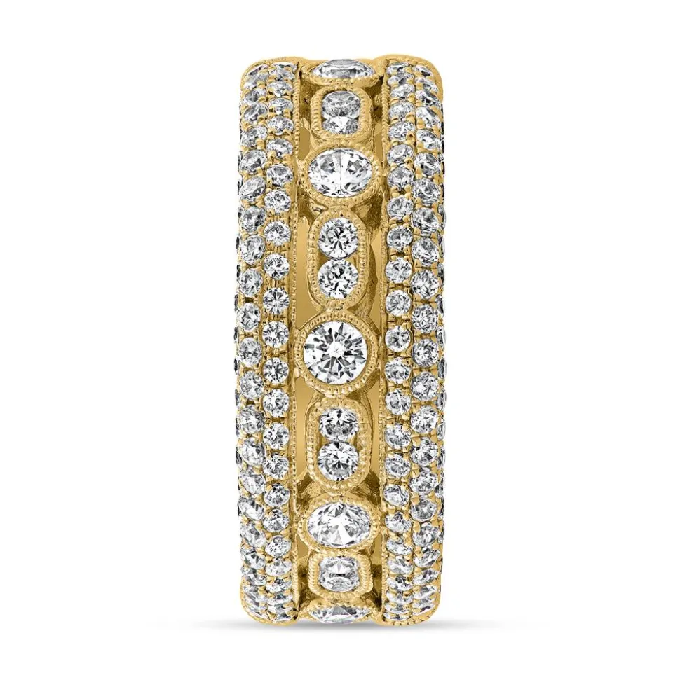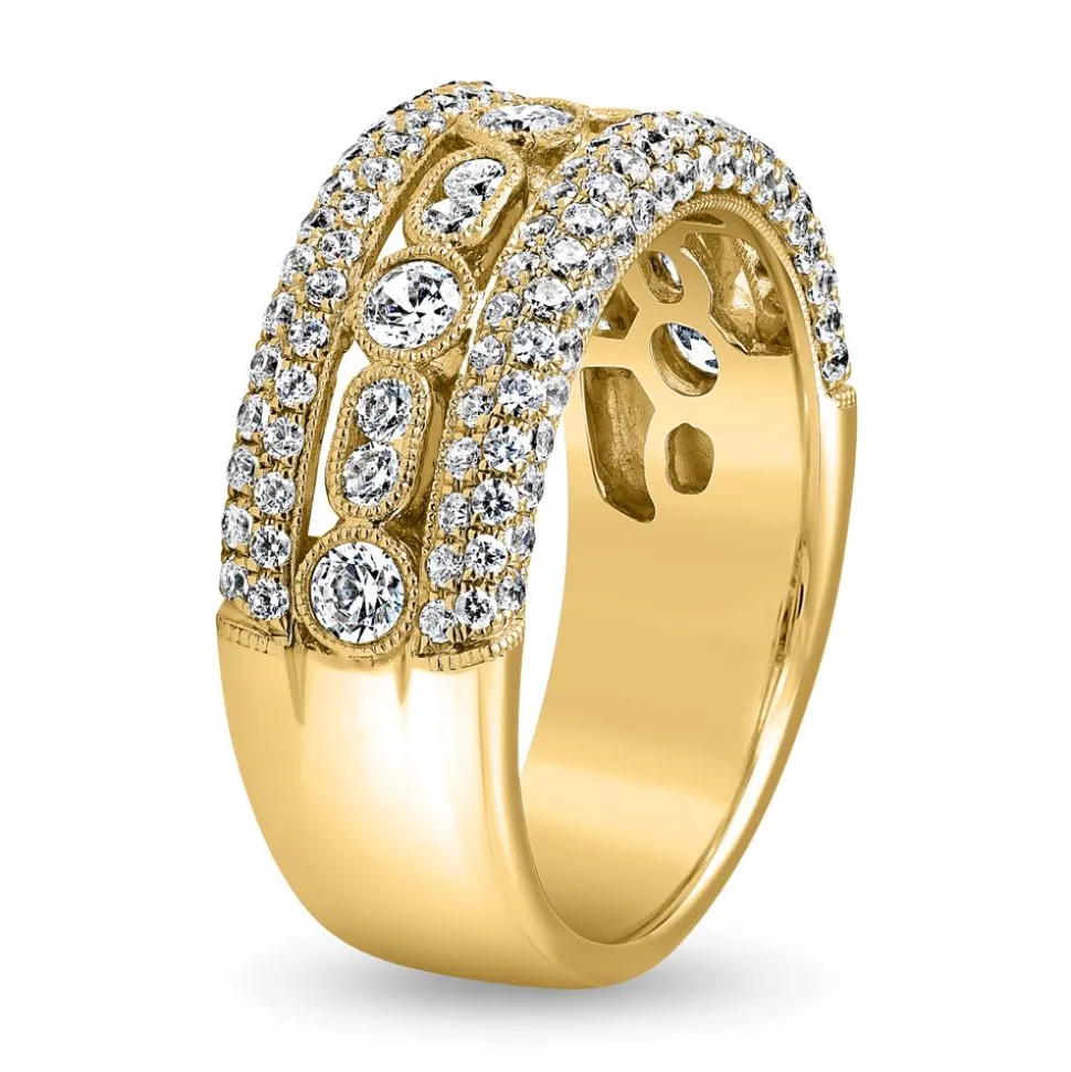 Ein traumhafter Blickfang – das ist dieser Goldring mit Diamantbesatz für Damen. Wahlweise aus 14- oder 18-karätigem Gelbgold gefertigt, kann die gewünschte Legierung ganz einfach über die Drop-down-Liste ausgewählt werden. Der Ring besitzt eine durchbrochene Mitte, in der abwechselnd runde und ovale Fassungen mit Perlierung angeordnet sind. In den runden Fassungen befindet sich ein Diamant und die ovalen Fassungen tragen jeweils zwei. Weitere Diamanten befinden sich in einer Pavéfassung an den Seiten der Ringschiene. Die 151 Brillanten mit insgesamt ca. 1,19 ct. zieren die gesamte vordere Hälfte des Rings. Ihre Farbe ist als „Top Wesselton“ klassifiziert und ihre Reinheit zählt zur Kategorie „small inclusions“. Selbstverständlich stammen alle Diamanten aus konfliktfreien Quellen. Auf Wunsch kann eine Innengravur vorgenommen werden.