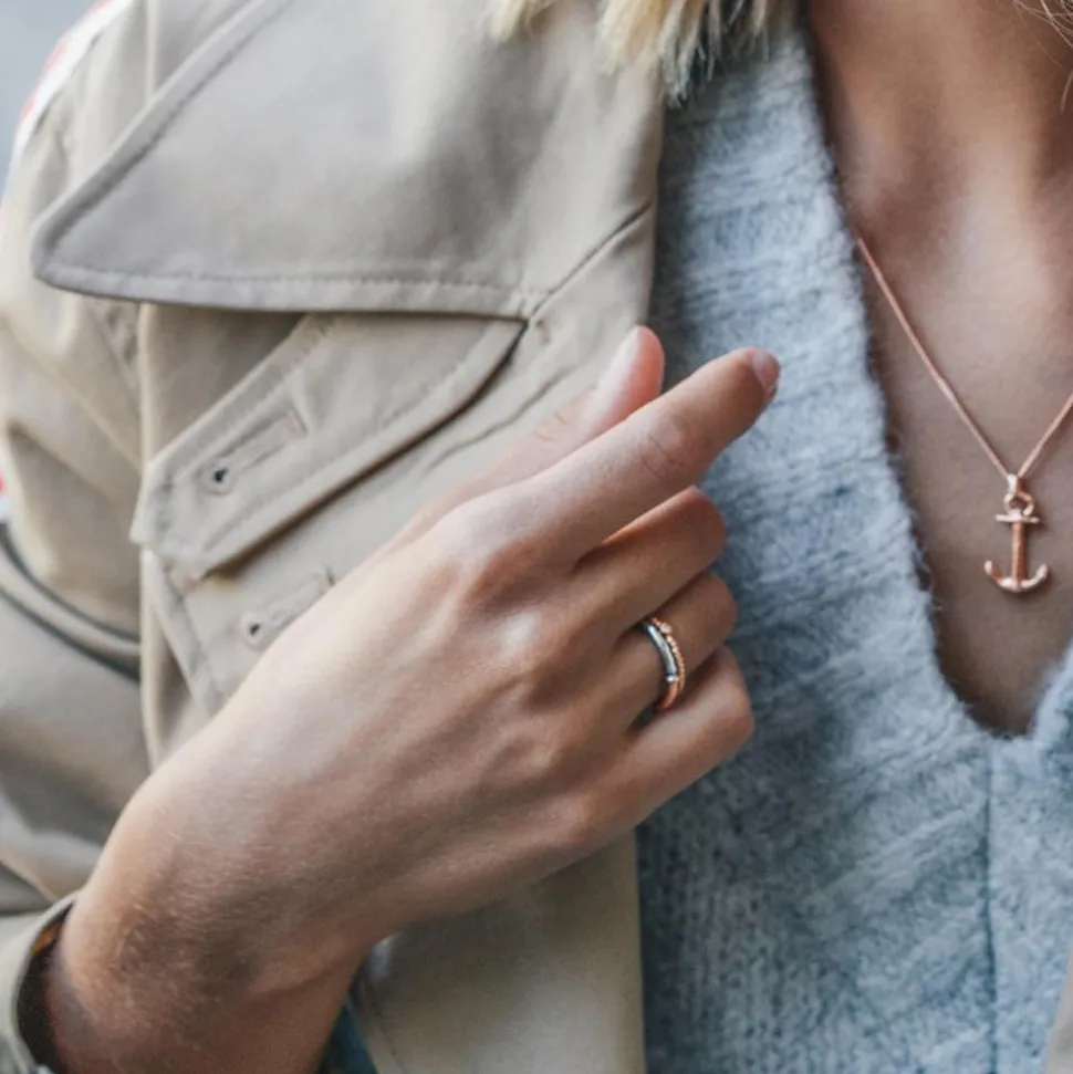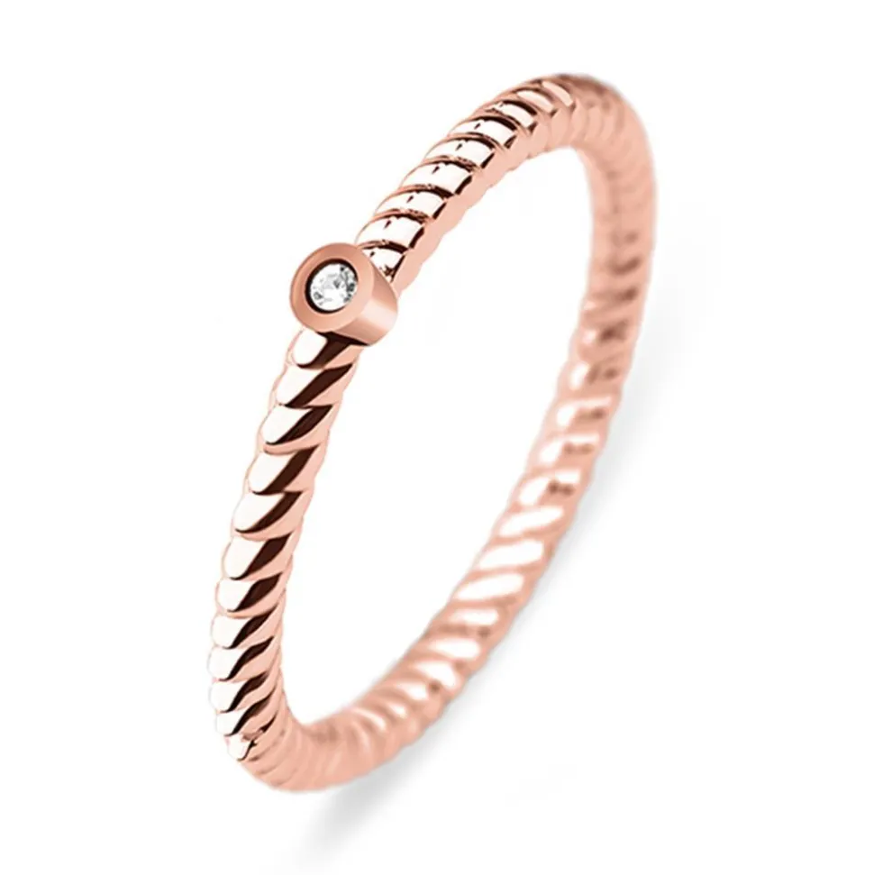Trendig und maritim – das ist dieser Ring aus rosévergoldetem Edelstahl. Die Ringschiene erinnert an ein Tau und wird zudem von einem zargengefassten Swarovski-Kristall geziert. Dadurch, dass der Ring so grazil ist, kann ein hoher Tragekomfort gewährleistet werden.