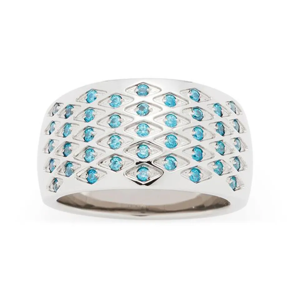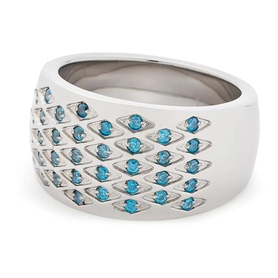 Ein wirkungsvoller und frischer Blickfang – das ist dieser Ring. Er ist aus Edelstahl gefertigt und besitzt rautenförmige Vertiefungen, in welchen je ein türkiser Zirkoniastein sitzt.