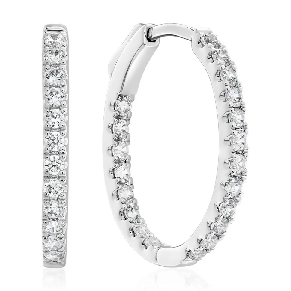 Diese Ohrringe für Damen begeistern mit ihrem klassischen Design und den hochwertigen Materialien! Sie sind wahlweise aus 585er oder 750er Weißgold oder 950er Platin gefertigt. Bitte die bevorzugte Legierung im Drop-down-Feld auswählen. Absoluter Blickfang ist der funkelnde Steinbesatz: Insgesamt zieren 40 Diamanten im Brillantschliff (ca. 0,73 ct.; Farbe: Top Wesselton; Reinheit: small inclusions) sowohl die vordere Außenseite als auch die hintere Innenseite der Creolen. Für uns ist es selbstverständlich, dass die Diamanten ausschließlich aus konfliktfreien Quellen stammen.