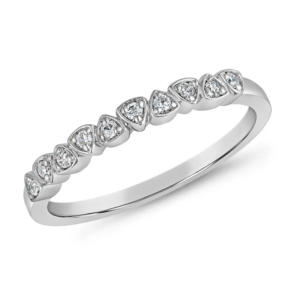 Mit einem außergewöhnlichen Design zieht dieser Damenring alle Blicke auf sich. Wahlweise aus 14- oder 18-karätigem Weißgold oder aus 950er Platin gefertigt, lässt sich die gewünschte Legierung mithilfe des Drop-down-Felds auswählen. Der vordere Teil der Ringschiene besteht dabei aus dreieckigen Fassungen, die abwechselnd nach oben oder unten zeigend angeordnet sind. In jeder der Fassungen befindet sich jeweils ein funkelnder Diamant. Die 10 Diamanten im Brillantschliff besitzen insgesamt ca. 0,10 ct. und zeichnen sich durch eine hohe Qualität aus (Farbe: TW, Reinheit: SI). Da uns auch ethische Kriterien wichtig sind, verarbeiten wir ausschließlich Diamanten aus konfliktfreien Quellen. Die Innenseite des Rings kann mit einer Gravur versehen werden.