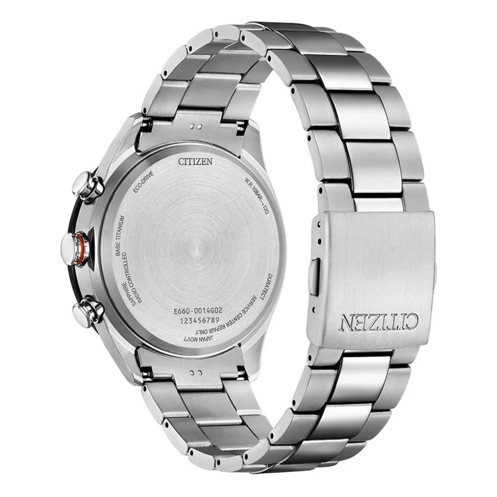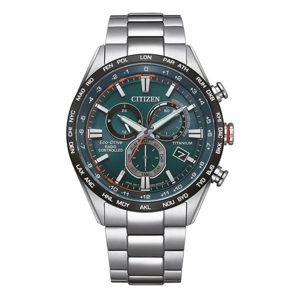 Mit einem modernen Design überzeugt diese solarbetriebene Funkuhr für Herren. Sie ist aus satiniertem Super Titanium gefertigt, was durch die Citizen Duratect Oberflächenhärtung fünfmal härter und 40 Prozent leichter als Edelstahl ist. Die Uhr besitzt ein Quarzuhrwerk mit Eco-Drive-Technologie, welches einfallendes Licht in Energie für den Antrieb umwandelt (Gangreserve: 300 Tage, Dunkelgangreserve: 3 Jahre). Als Funkuhr kann sie außerdem die Weltzeit aus vier Zeitzonen empfangen und die Ortszeit von insgesamt 24 Städten anzeigen. Auf dem dunkelgrünen Sunray-Zifferblatt mit roten Details befindet sich eine Datums-, Wochentags- und 24-Stundenanzeige. Zudem besitzt die Uhr lumineszierende Zeiger, einen ewigen Kalender und eine Stoppfunktion. Die schwarze ionenplattierte Lünette trägt die Städtecodes. Kratzfestes Saphirglas schützt das Zifferblatt. Das Gehäuse der Uhr wird von einem teils mattierten und teils polierten Gliederarmband aus Super Titanium gehalten, das mit einer Sicherheitsfaltschließe verschlossen wird. Die Uhr ist bis zu 10 bar wasserfest.