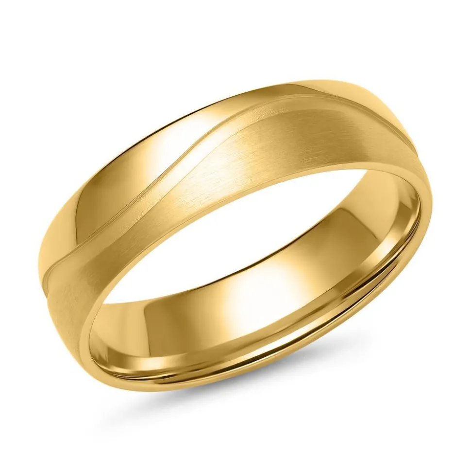 Eine raffinierte Oberfläche zeichnet diese Eheringe aus Gold aus. Sie sind sowohl in 333er als auch in 585er Gold erhältlich. Mit dem Drop-down-Feld lässt sich die bevorzugte Legierung ganz einfach auswählen. Ihre Ringschienen werden von einer geschwungenen, breiten Rille in sandmatter Optik geziert, die die Ringoberflächen in eine polierte und eine mattierte Hälfte teilt. In der sandmatten Rille des Damenrings sind 5 brillantgeschliffene Diamanten platziert, die insgesamt ca. 0,05 ct. aufweisen. Ihre Reinheit gehört zur Kategorie VS1 und ihre Farbe ist als TW klassifiziert. Neben einer hohen Qualität verfügen die Brillanten auch über einen konfliktfreien Ursprung, da uns auch ethische Aspekte am Herzen liegen. Die Ringe sind innen leicht abgerundet, wodurch sie sich angenehm tragen lassen. Auf Wunsch kann unser Gravurteam noch eine individuelle Gravur vornehmen. Für diese Eheringe steht zudem unser Dummy Service zur Verfügung. Somit kann die Passform und das Design vorab getestet werden. Mehr Informationen dazu sind unter „Dummy Service“ weiter unten zu finden.