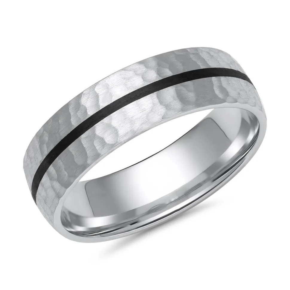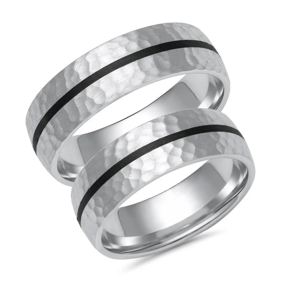 Diese Eheringe überzeugen mit ihrem trendstarken Design. Da sie wahlweise in 333er oder 585er Weißgold oder aber in 950 Platin erhältlich sind, kann die bevorzugte Legierung mithilfe des Drop-down-Feldes ausgesucht werden. Die Eheringe besitzen eine gehämmerte Oberfläche mit einem längs verlaufenden Carbon-Inlay in der Mitte. Dabei harmoniert die schwarze Farbe des Carbons perfekt mit dem kühlen Silberton des Weißgolds oder Platins. Für einen idealen Tragekomfort sorgt die leichte Abrundung der Ringschienen auf der Innenseite. Gerne können die Ringe noch mit einer inneren Gravur versehen werden. Damit die Passform und das Design vorab getestet werden können, stellen wir für diese Eheringe einen Dummy Service zur Verfügung. Weiterführende Informationen dazu gibt es unter „Dummy Service“ etwas weiter unten.