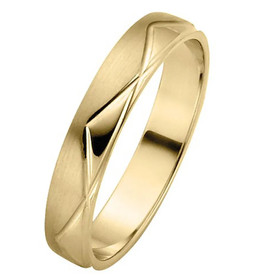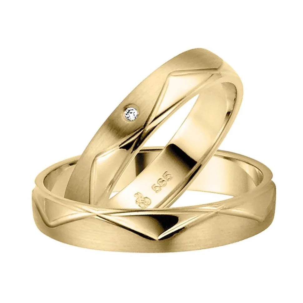 Überaus chic – das sind diese Eheringe aus Gold. Sie stammen aus der Kollektion „Pair 2“ von Rauschmayer und zeichnen sich durch ihr formschönes Design aus. Die Ringschienen werden von einem Zacken-Muster mit teils polierten und teils längs-mattierten Partien geziert. Zahlreiche Glanzrillen setzen ebenfalls ansprechende Akzente. Für mehr Tragekomfort besitzen die Ringe eine innenseitige Bombierung. Der Damenring hebt sich mit seinem ca. 0,10 ct. großen Brillanten hervor (Reinheit: small inclusions, Farbe: Wesselton, konfliktfrei). Auf Wunsch kann eine individuelle Gravur hinzugefügt werden.