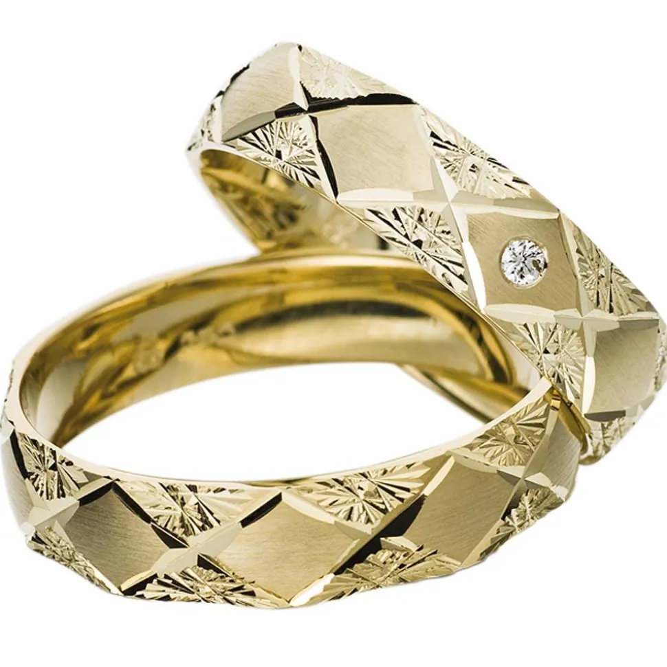 Ihr raffiniertes Rautenmuster verleiht diesen Eheringen einen unverwechselbaren Charakter. Die Ringe sind aus feinmattem Gold gefertigt und gehören zur „Elements“-Kollektion von Rauschmayer. Der Damenring besticht mit seinem ca. 0,02 ct. schweren Diamanten im Brillantschliff. Dieser verfügt über die Farbe „Wesselton“ und eine Reinheit aus der Kategorie „Piqué II“. Zudem zeichnet er sich durch einen konfliktfreien Ursprung aus. Dank der inneren Bombierung weisen die Ringe einen hohen Tragekomfort auf. Unser erfahrenes Gravurteam fügt auf Wunsch eine individuelle Innengravur hinzu.