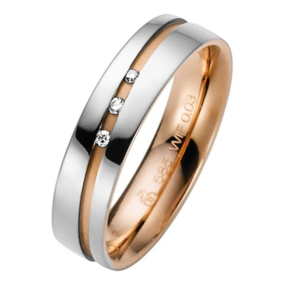 Ein traumhaftes Ringpaar in Bicolor – das ist dieses 14-karätige Eheringset aus der Sandwich zwei-Kollektion von Rauschmayer. Eine diagonale sandmatte Rille aus Roségold durchzieht die polierte Oberfläche aus Weißgold. Der Damenring wird zudem von 3 Brillanten mit insgesamt ca. 0,03 ct. geziert. Ihre Reinheit gehört zu der Kategorie „small inclusions“ und ihre Farbe ist als „Wesselton“ klassifiziert. Außerdem stammen alle 3 Diamanten aus konfliktfreien Quellen. Angenehm zu tragen sind die Ringe durch ihre innere Bombierung. Mit einer Gravur auf der Innenseite können die Ringe noch individuell gestaltet werden.