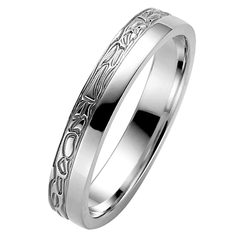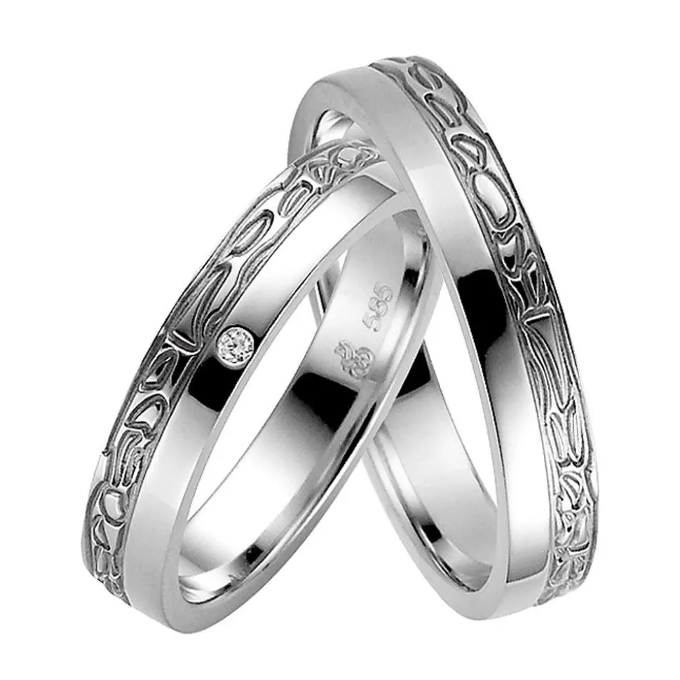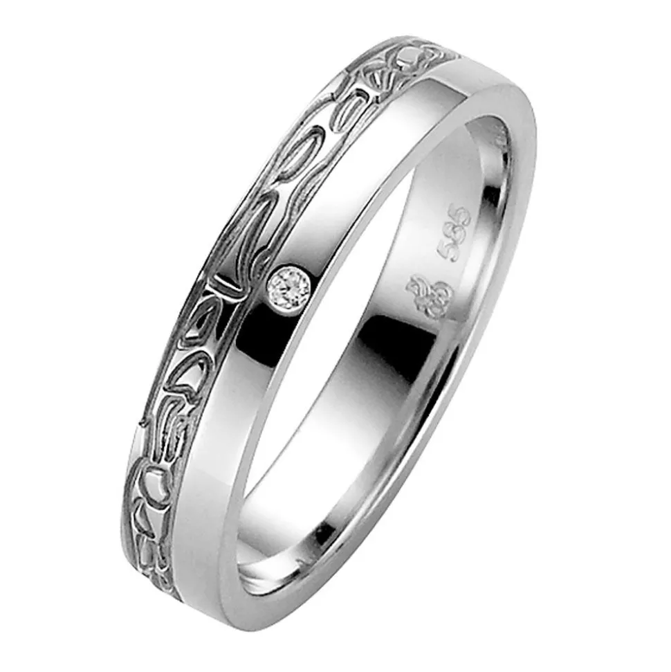 Aus Weißgold gefertigt und zur Hälfte mit dekorativen Verzierungen versehen, sind diese Ringe die perfekten Wegbegleiter für die Ehe. Sie stammen aus der Kollektion „Elements 2“ von Rauschmayer und verfügen dank ihrer innenseitigen Abrundung über ein äußerst angenehmes Tragegefühl. Der Damenring wird zudem noch von einem Brillanten geziert (ca. 0,01 ct., Farbe: Wesselton, Reinheit: small inclusions, aus konfliktfreien Quellen). Gerne fügt unser erfahrenes Gravurteam eine individuelle Gravur hinzu.