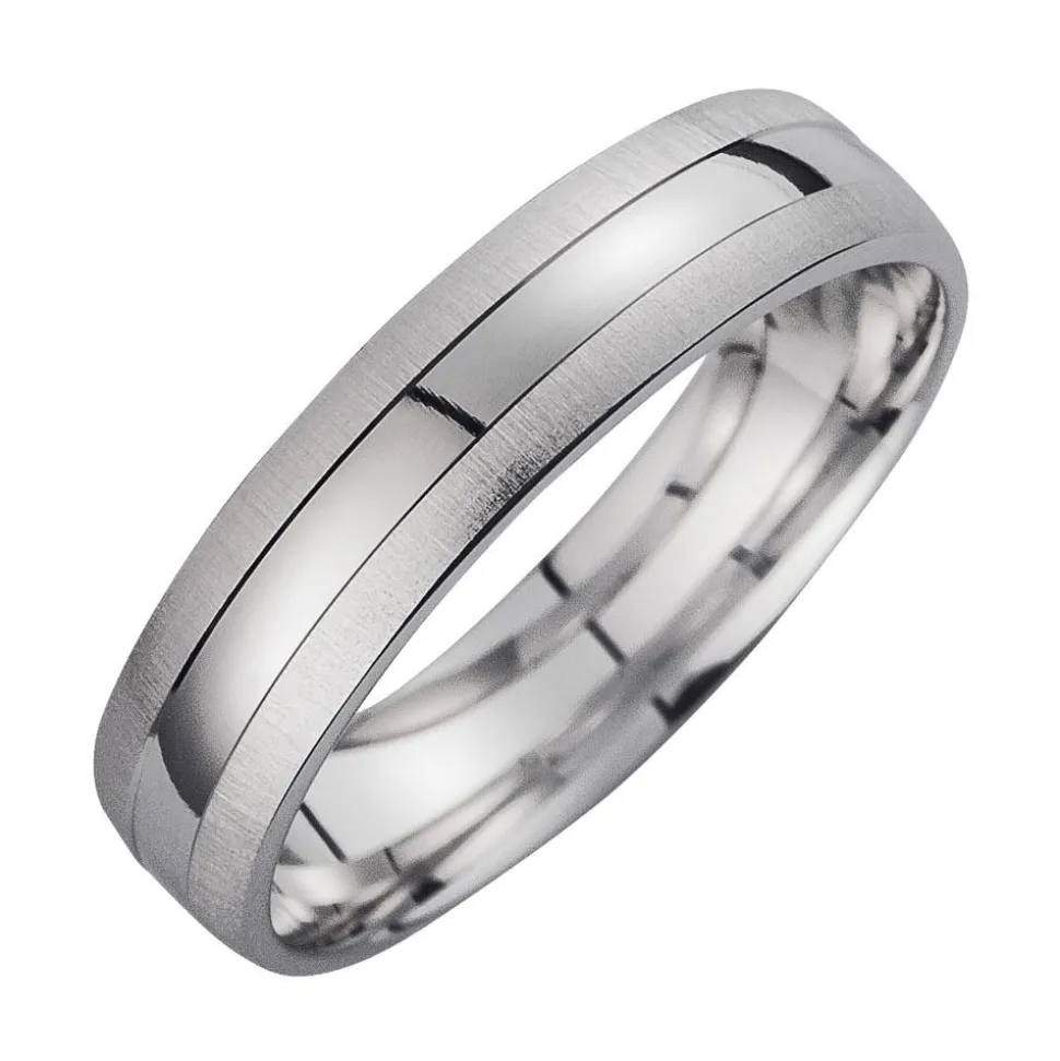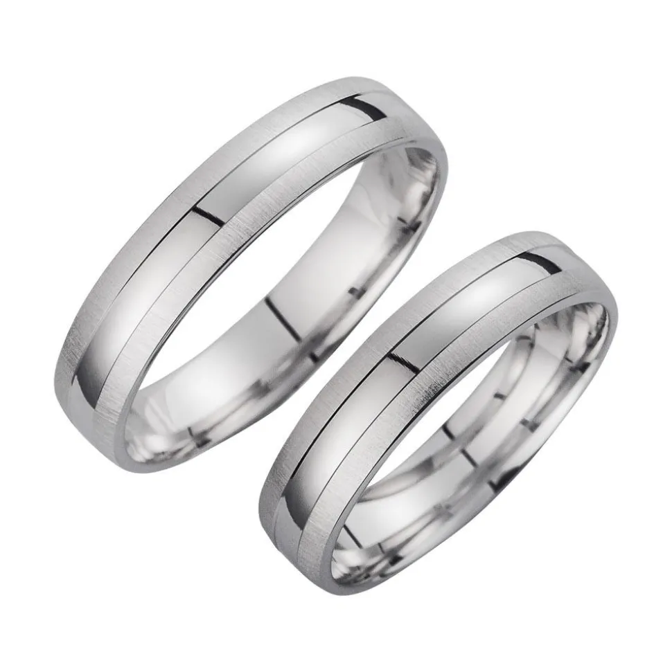 Trauringe in Weißgold mit einer querfeinmatten und hochglanzpolierten Oberfläche, einer Stärke von 1,2 mm und einer Breite von 4,5 mm. Die Ringe sind bombiert (abgerundet) und die äußere Ringform ist rund. Bei uns wird Qualität groß geschrieben. Daher prüfen wir jeden einzelnen Ring, bevor er unser Haus verlässt. Die Ringe sind rhodiniert und somit anlaufgeschützt. Zudem sind die Eheringe gravierbar und können mit einer persönlichen Botschaften versehen werden.