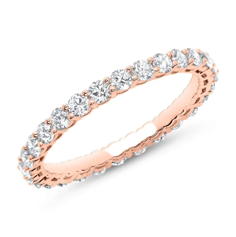 Die 28 brillantgeschliffenen Diamanten (ca. 1,08 ct.) in Krappenfassung sind das funkelnde Highlight dieses Eternity-Ringes. Einen ansprechenden Kontrast zu dem reinweißen Strahlen der Brillanten bildet der edle Glanz des Roségoldes (14 Karat) – formvollendete Juwelierskunst. Die Farbe der Diamanten, die die gesamte Ringschiene zieren, ist klassifiziert als Feines Weiß (Top Wesselton) und die Reinheit der Steine fällt in die Kategorie SI (small inclusions). Wir legen bei unserem Diamantschmuck nicht nur Wert auf eine exzellente Qualität, die bei jedem einzelnen Ring von Hand geprüft wird, sondern auch auf ethische Aspekte. Deshalb stammen unsere Diamanten ausschließlich aus konfliktfreien Quellen.