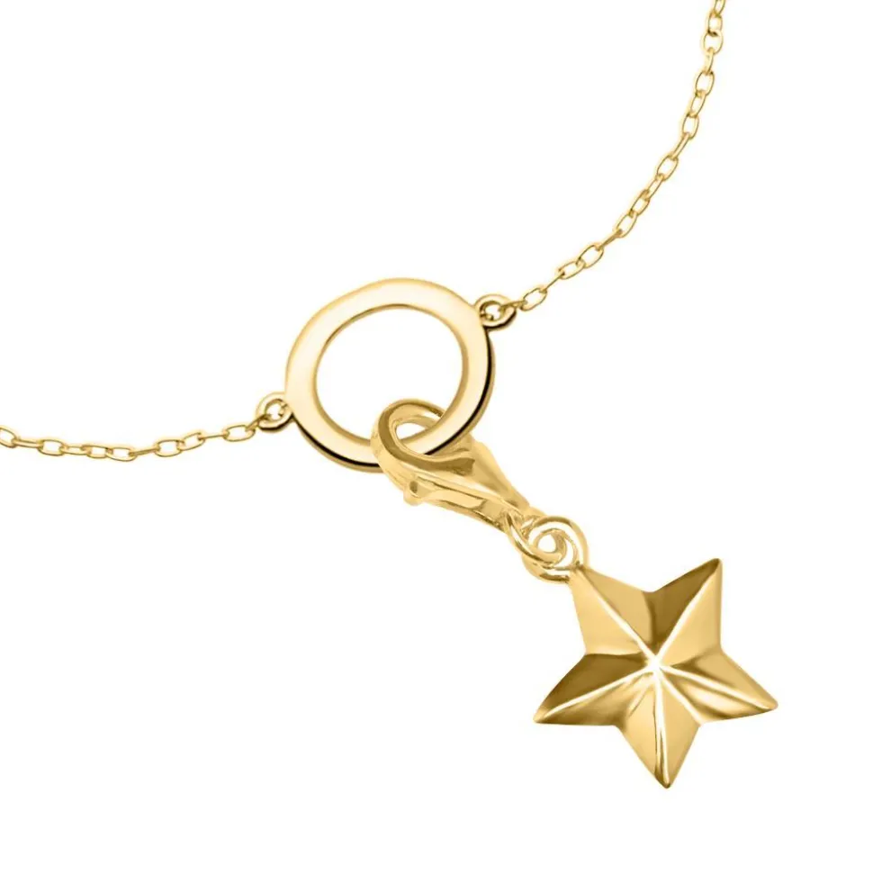 Der Anhänger in Kreisform ist ebenso filigran gearbeitet wie das Armband, an dem er befestigt ist. Sowohl der Anhänger als auch das Armband bestehen aus gelbgoldenem 925er Sterlingsilber. Das Kreisdesign ist genauso einfach wie genial. Kreise als zierende Elemente im Schmuckbereich gibt es schon seit Jahrhunderten und trotzdem versprühen sie immer einen modern jugendlichen Charme, ohne dabei übertrieben zu wirken. Durch ein praktisches Verlängerungselement kann das Armband in der Länge variiert werden. Geschlossen wird es mit einem praktischen Karabinerverschluss.