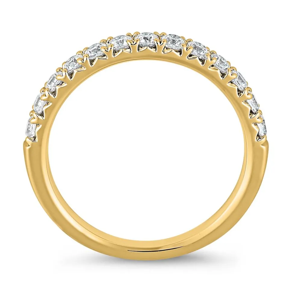 Dieser Damenring ist ein bezaubernder Klassiker aus 14- oder 18-karätigem Gelbgold. Die vordere Hälfte der Ringschiene fasst 13 lab-grown Brillanten, die über insgesamt ca. 0,49 ct. verfügen. Zudem weisen alle Diamanten die Farbe River – Top Wesselton und die Reinheit very, very small inclusions – very small inclusions auf. Die Diamanten aus dem Labor bestehen zu 100 % aus Kohlenstoff. Wie auch natürliche Diamanten verfügen sie über die gleiche Härte und Brillanz. Über die Drop-down-Liste kann die bevorzugte Legierung ausgewählt werden. Die Innenseite ist gravierbar.
