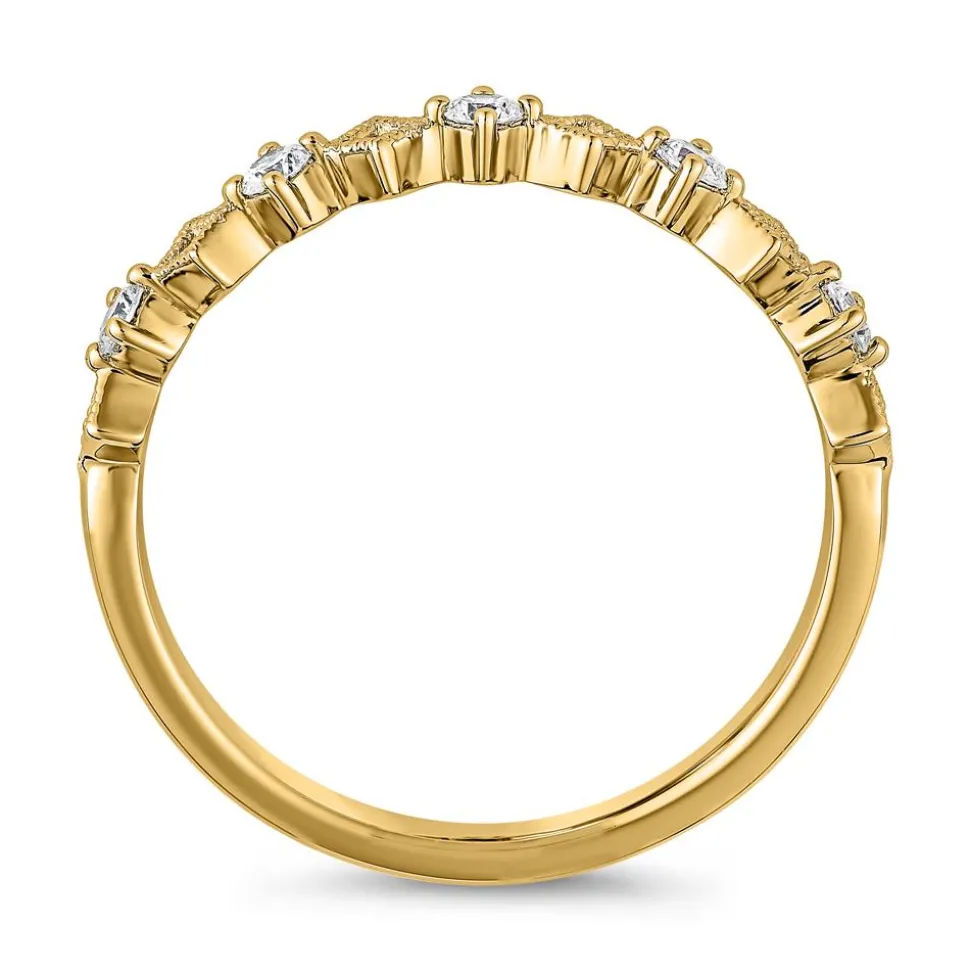 Mit einem einzigartigen Design begeistert dieser Damenring aus 14 oder 18 Karat Gelbgold. Im vorderen Bereich der Ringschiene wechseln sich krappengefasste Brillanten mit kunstvoll gestalteten rautenförmigen Elementen ab. Die Rauten besitzen eine feine Prägung sowie filigrane Cut-outs. Die 5 Brillanten haben zusammen ein Gewicht von ca. 0,17 ct., bestechen durch die Reinheitskategorie „small inclusions“ und die Farbklassifikation „Top Wesselton“. Für die Fertigung werden ausschließlich Diamanten mit konfliktfreiem Ursprung verwendet. Die Auswahl der Legierung erfolgt bequem über das Drop-down-Menü. Auf Wunsch kann eine individuelle Gravur auf der Innenseite angebracht werden.