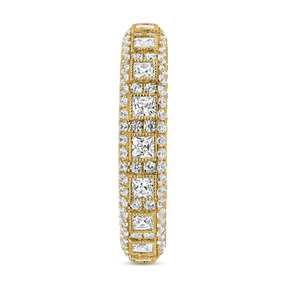 Dieser luxuriöse Damenring aus 14 Karat oder 18 Karat Gelbgold verzaubert durch seine atemberaubende Eleganz. Die Vorderseite des Rings ist reich mit 129 funkelnden Diamanten besetzt, die ein eindrucksvolles Strahlen erzeugen. Neun Diamanten im Princess-Schliff (ca. 0,39 ct. gesamt) sind auf der Oberseite gleichmäßig nebeneinander angeordnet. Sie werden jeweils von einem feinen, quadratischen Rahmen mit Perlierung umgeben, was dem Design eine stilvolle Struktur verleiht. Zwischen den großen Diamanten und entlang der Ränder des Rings sind insgesamt 120 kleinere Brillanten (ca. 0,51 ct. gesamt) eingefasst. Alle Diamanten sind in der Farbe „Top Wesselton“ und besitzen die Reinheitsstufe „small inclusions“. Selbstverständlich stammen sämtliche Steine aus konfliktfreien Quellen. Das mitgelieferte Brilladia-Zertifikat gibt Auskunft über die Qualität der Steine. Über die praktische Drop-down-Liste kann die bevorzugte Legierung ausgewählt werden. Eine persönliche Gravur auf der Innenseite verleiht dem Ring eine persönliche Note.