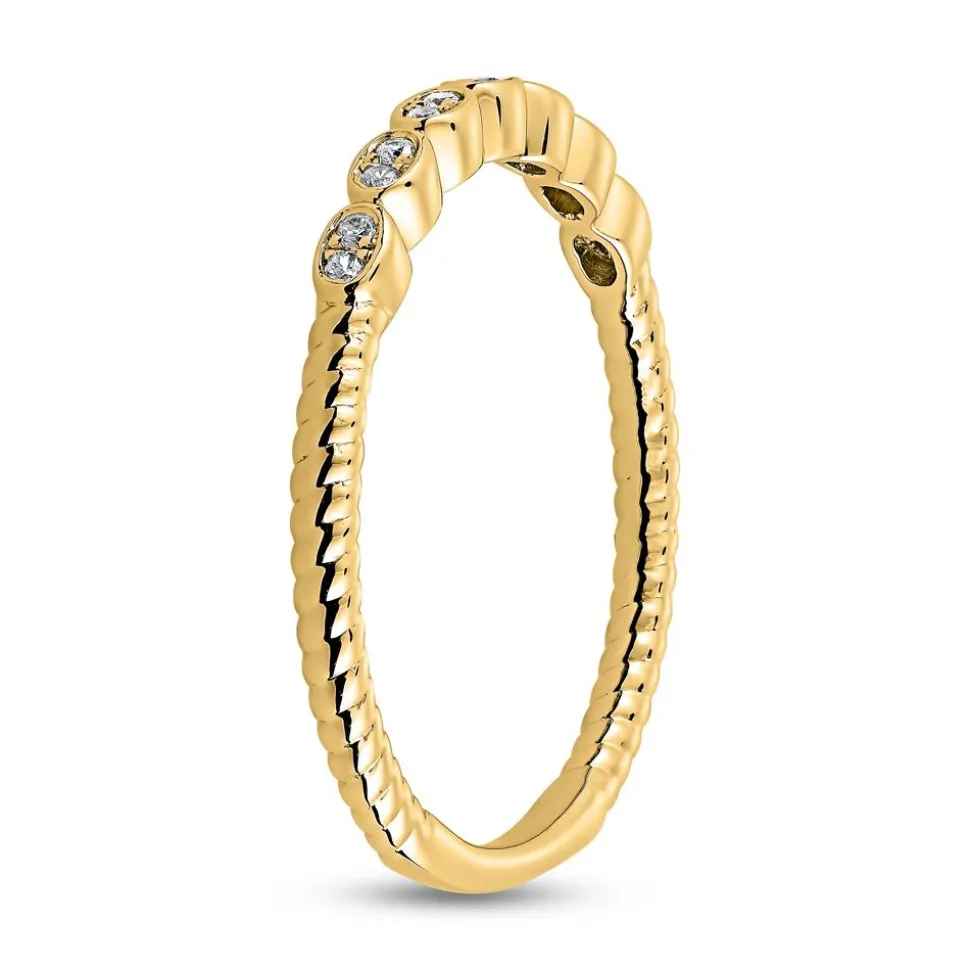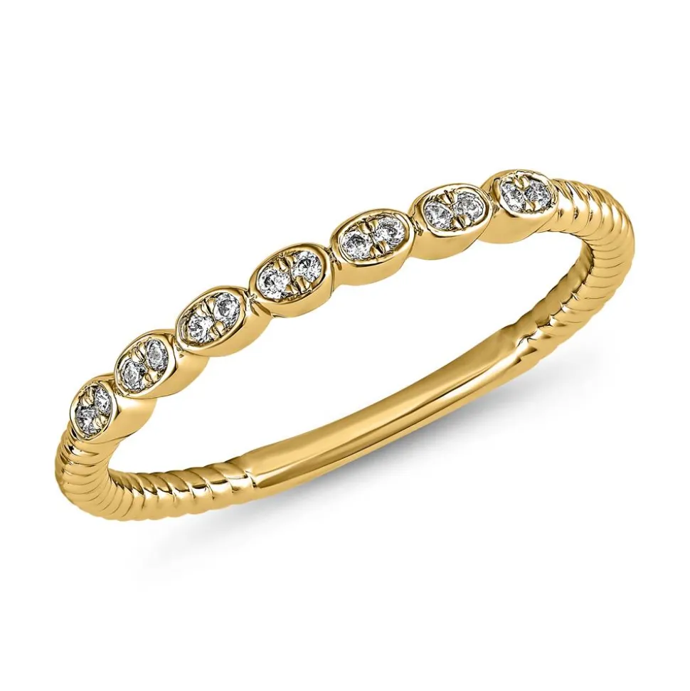 Das moderne Erscheinungsbild dieses Diamantrings spricht für sich. Der Ring ist wahlweise aus 14 oder 18 Karat Gelbgold gefertigt. Die gewünschte Legierung kann über das Drop-down-Feld ausgesucht werden. Die kordelförmige Ringschiene wird im vorderen Bereich noch von sieben ovalen Fassungen begleitet, die mit jeweils zwei Diamanten besetzt sind. Insgesamt befinden sich 14 Brillanten mit einem Gesamtgewicht von etwa 0,09 ct. auf dem Ring. Die Farbe der Diamanten ist als „Top Wesselton“ klassifiziert und ihre Reinheit gehört zur Kategorie „small inclusions“. Da wir zudem viel Wert auf ethische Aspekte legen, verarbeiten wir ausschließlich Diamanten mit einer konfliktfreien Herkunft.