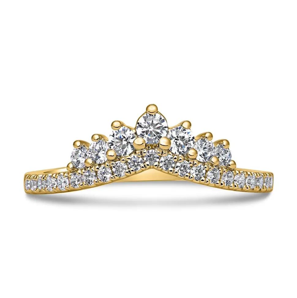 Dieser Damenring besicht mit seinem royalen Design. Er besteht wahlweise aus 14- oder 18-karätigem Gelbgold und verfügt über eine v-förmige Ringschiene. Diese ist auf der Vorderseite mit 21 brillantgeschliffenen Diamanten (ca. 0,19 ct. gesamt) besetzt. Oberhalb der Ringschiene befinden sich 7 weitere Brillanten (ca. 0,26 ct. gesamt), die von jeweils drei Krappen gehalten werden. Sie verleihen dem Ring ein traumhaftes Kronen-Design. Die Diamanten beeindrucken mit ihrer Farbqualität „Top Wesselton“ und der Reinheit „small inclusions“. Alle Steine stammen aus konfliktfreien Quellen. Die gewünschte Legierung kann bequem über das Drop-down-Menü gewählt werden, und eine individuelle Gravur macht den Ring zu einem persönlichen Schmuckstück.