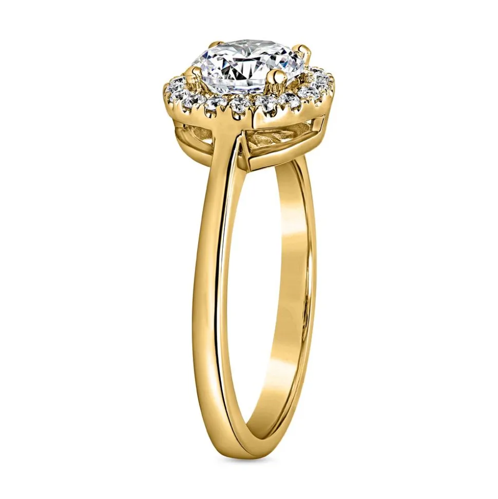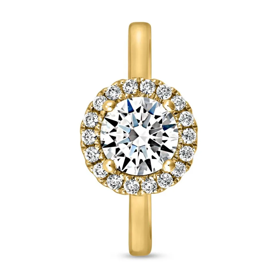 Ein wundervoller Diamantring mit einem Ringkopf im Halo-Design. Dieser Verlobungsring sticht durch seinen ca. 1,00 ct. schweren Brillanten im Zentrum hervor. Der Diamant ist von 18 kleineren Diamanten (ca. 0,18 ct. gesamt) umgeben und sorgt für faszinierende Brillanz. Die Reinheit der Diamanten fällt in die Kategorie „small inclusions“ und ihre Farbe ist als „Top Wesselton“ klassifiziert. Ihre Herkunft ist selbstverständlich konfliktfrei und ein GIA-Zertifikat bestätigt alle wertbestimmenden Merkmale des Hauptdiamanten. Die bevorzugte Legierung (entweder 14 Karat oder 18 Karat Gelbgold) lässt sich mithilfe der Drop-down-Liste auswählen. Gerne fügen unsere Graveure noch eine persönliche Gravur auf der Innenseite hinzu.