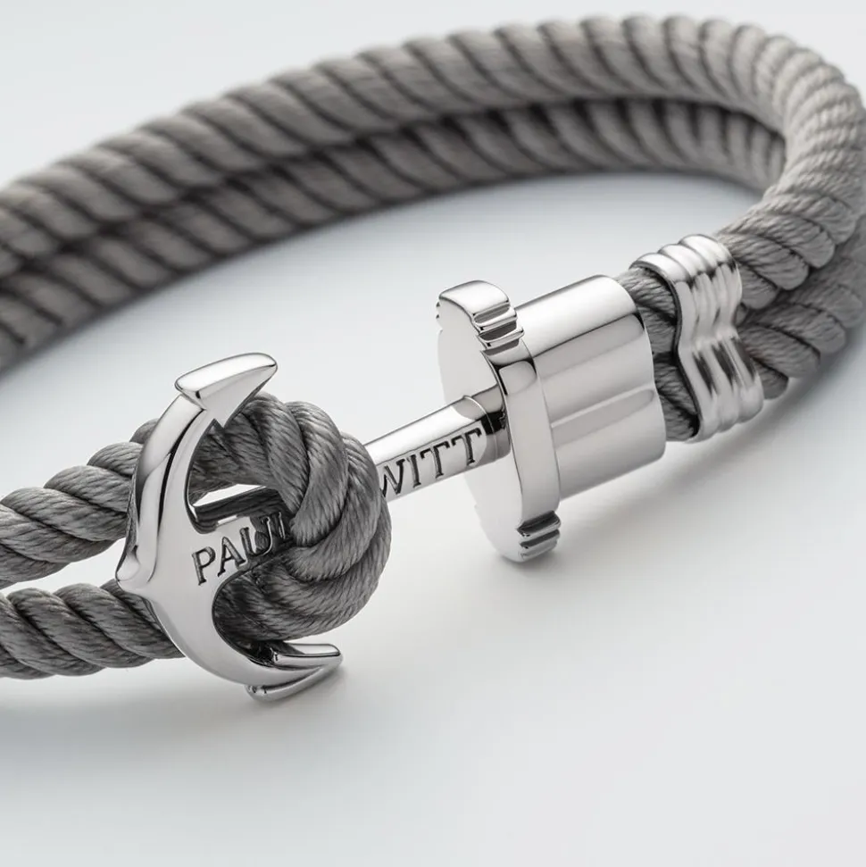 Ein lässiger Begleiter im Alltag – das ist dieses Herrenarmband von der Trendmarke Paul Hewitt. Das gekordelte, graue Polyesterband des Armbands wird von einem Anker aus Edelstahl gehalten. Sowohl das Polyesterband als auch die Edelstahlelemente bestehen aus recycelten Materialien.