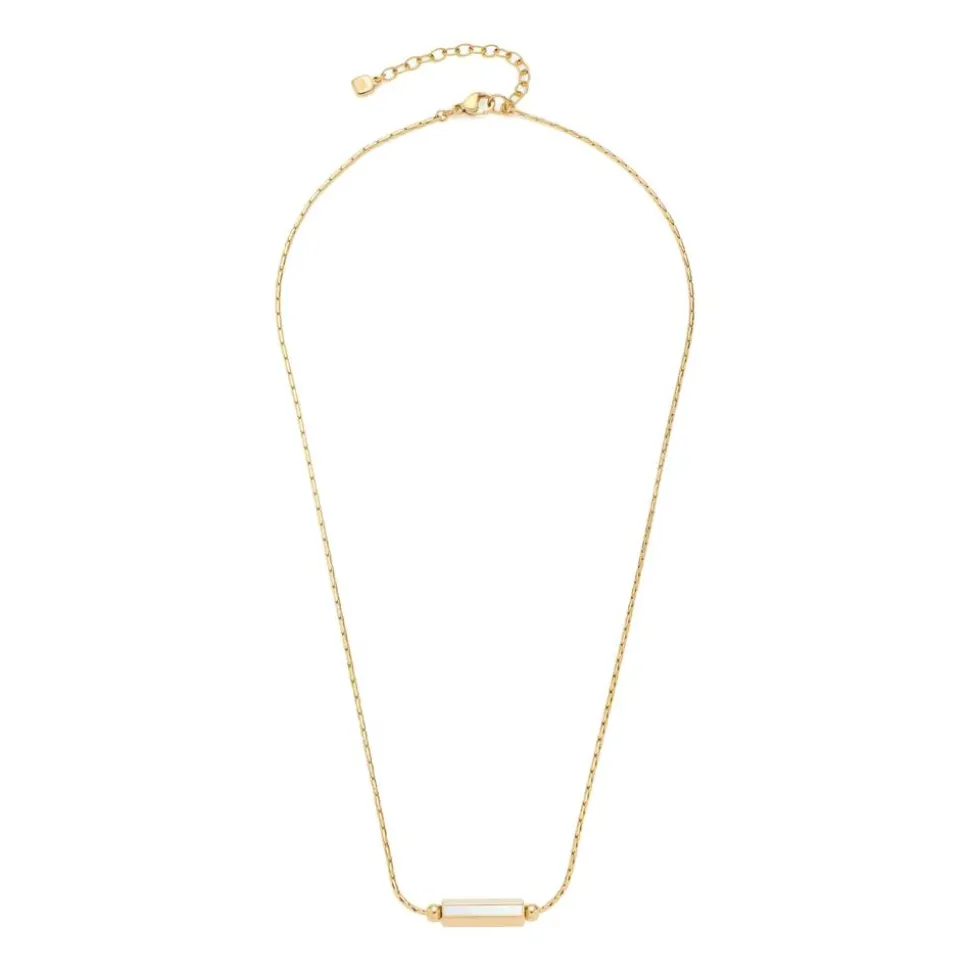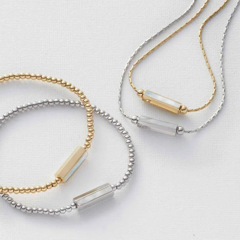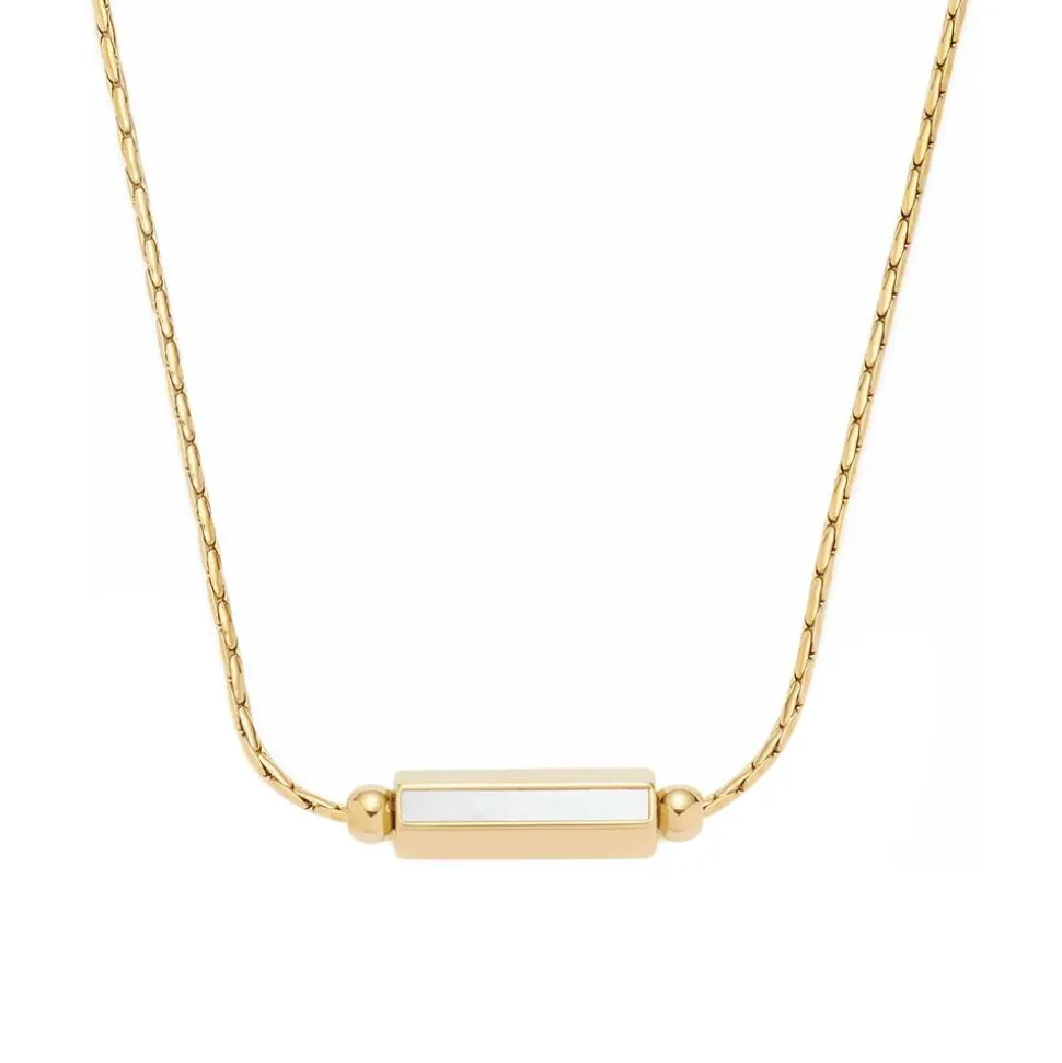 Mit einem ansprechenden Design begeistert diese Halskette für Damen. Sie ist goldfarben ionenplattiert und besitzt eine fantasievolle Kettengliederung. Ein sechseckiges Schmuckelement in Zylinderform ziert die Kette. Dieses ist teilweise mit weißem Perlmutt versehen und kann individuell graviert werden. Eine vergoldete Edelstahlperle auf jeder Seite des Schmuckelements rundet das Design ab. Verschlossen wird die Kette mit einem Karabiner.