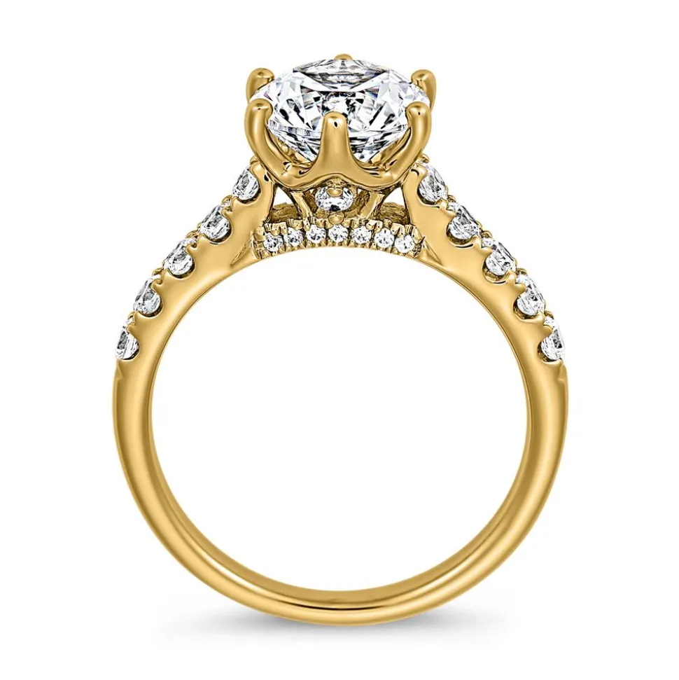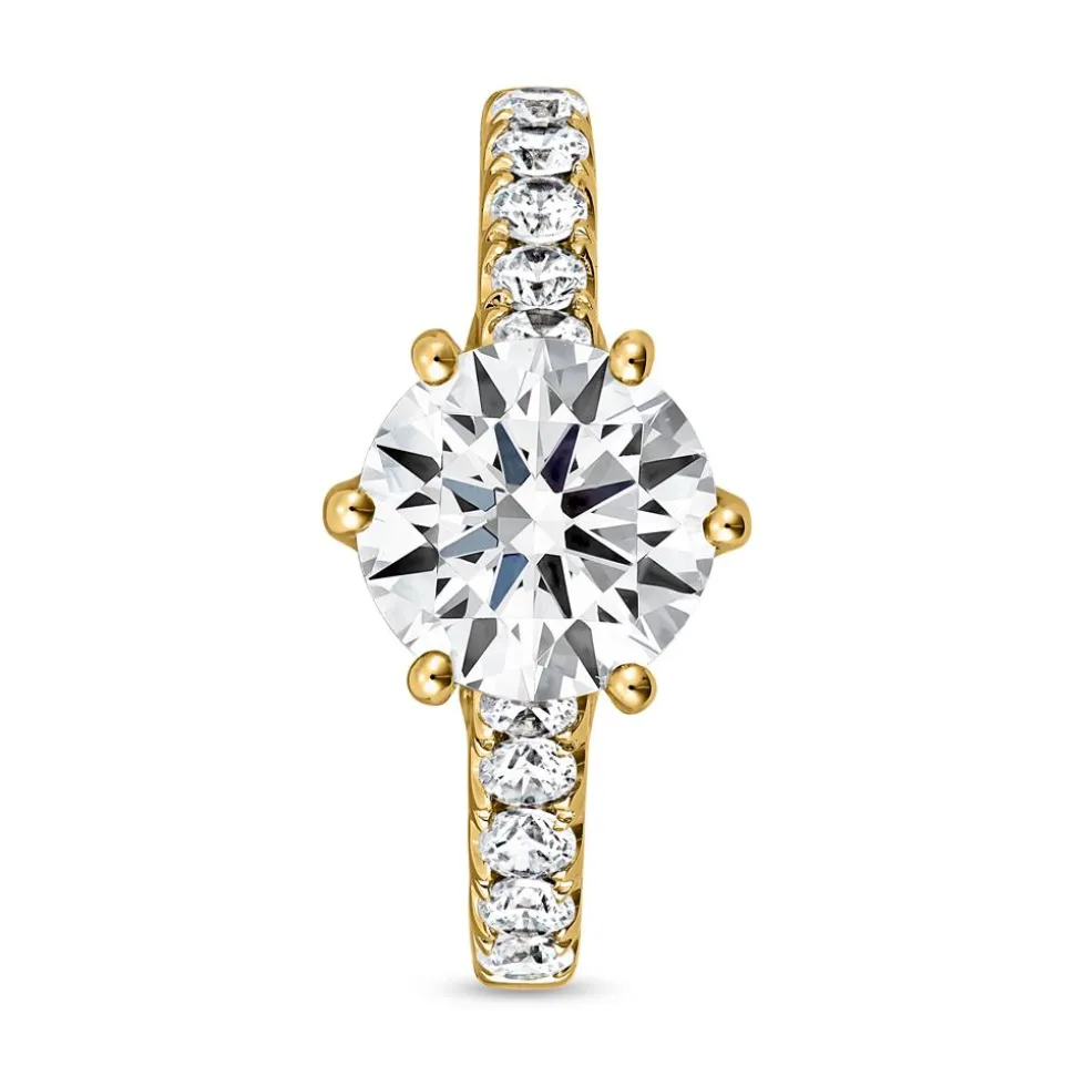 In einem königlichen Design präsentiert sich dieser Verlobungsring aus Gelbgold. Verfügbar in 14-karätigem oder 18-karätigem Gelbgold, kann die gewünschte Legierung über das Drop-down-Feld ausgewählt werden. Der krappengefasste lab-grown Brillant in der Mitte verfügt über ein Gewicht von ca. 2,00 ct. (G/SI) und zieht alle Blicke auf sich. Umrahmt wird der Hauptstein von 26 zusätzlichen lab-grown Diamanten, die sich unterhalb des Ringkopfs und entlang der Ringschiene befinden. Diese kleineren Diamanten weisen insgesamt ca. 0,52 ct. auf und sind als D-F (Farbe) und VVS-VS (Reinheit) klassifiziert. Alle Diamanten sind im Labor gezüchtet worden und bestehen zu 100 % aus Kohlenstoff. Ihre Härte und das charakteristische Funkeln sind identisch mit dem von natürlichen Diamanten. In dem IGI-Zertifikat sind alle wertbestimmenden Informationen zum Hauptdiamanten aufgeführt. Auf Wunsch kann die Innenseite des Rings individuell graviert werden.