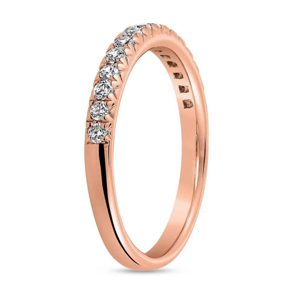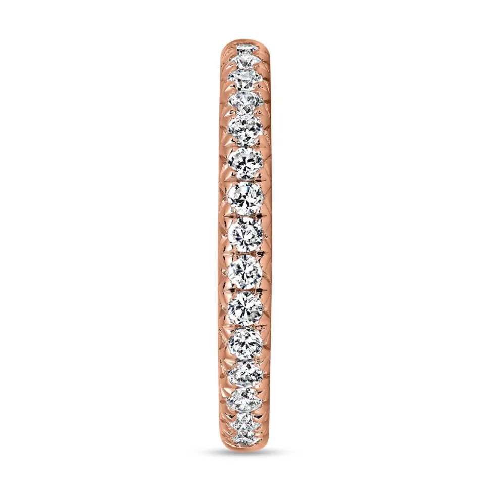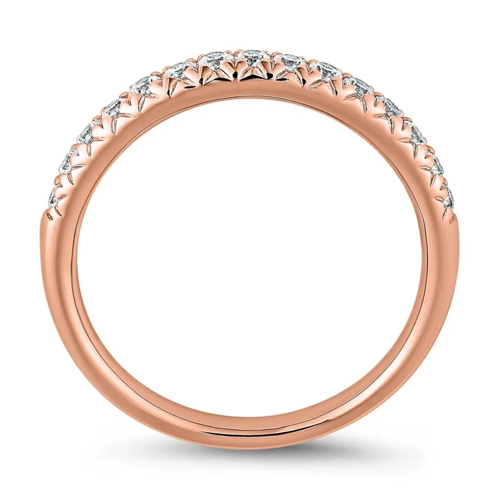 Dieser Ewigkeitsring mit halbem Steinbesatz setzt einen funkelnden Akzent in jedem Outfit. Bestehend wahlweise aus 14- oder 18-karätigem Roségold, lässt sich die bevorzugte Legierung ganz einfach über die Drop-down-Liste auswählen. Der vordere Teil der Ringschiene ist mit Diamanten im Brillantschliff besetzt. Dabei handelt es sich um 15 Brillanten mit insgesamt ca. 0,31 ct. aus einem konfliktfreien Ursprung. Die Farbe der Brillanten ist als TW (Top Wesselton) klassifiziert und ihre Reinheitskategorie entspricht der Klasse SI (small inclusions). Mit einer Wunschgravur auf der Innenseite kann der Ring noch eine individuelle Note erhalten.