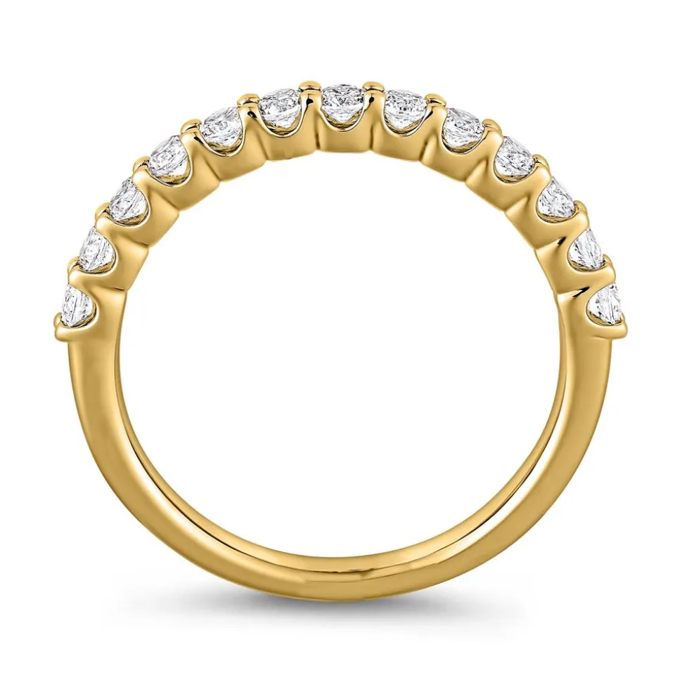 Traumhafte Krappenfassungen machen diesen Memoire-Ring für Damen zu einem echten Blickfang. Der Goldring ist entweder in einer 14- oder 18-karätigen Legierung verfügbar, die über das Drop-down-Feld ausgewählt werden können. Die Krappenfassungen auf der Vorderseite des Rings tragen insgesamt 13 Diamanten (ca. 0,52 ct. gesamt, TW/SI). Da wir neben einer hohen Qualität auch viel Wert auf ethische Kriterien legen, verarbeiten wir ausschließlich Diamanten mit konfliktfreier Herkunft. Die Innenseite des Rings ist gravierbar.