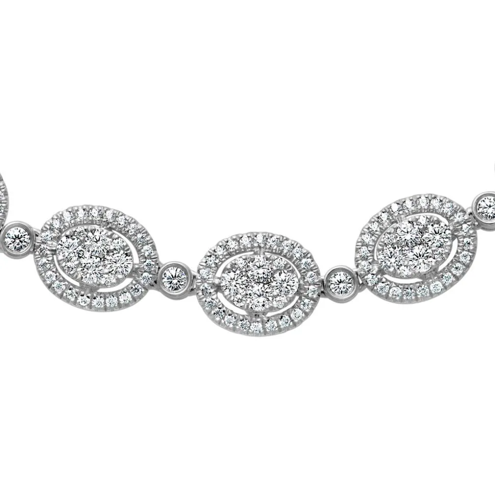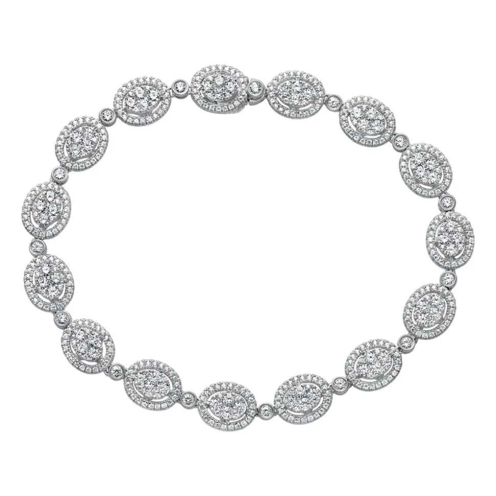 Atemberaubend schön – das ist dieses Diamantarmband für Damen. Es besteht aus mehreren ovalen Schmuckelementen im Halo-Stil, die im Wechsel mit zargengefassten Diamanten angeordnet sind. Die ovalen Schmuckelemente sind in der Mitte mit vier großen und vier kleinen Diamanten besetzt, die ein Pavé bilden. Sie werden jeweils von einem Kranz aus vielen kleinen Diamanten umgeben. Insgesamt bringen 495 Diamanten dieses edle Armband zum Strahlen. Die brillantgeschliffenen Diamanten besitzen insgesamt ca. 2,81 ct. und die Farbe der Steine ist klassifiziert als Feines Weiß (Top Wesselton). Ihre Reinheit fällt in die Kategorie SI (small inclusions) und ihre Herkunft ist selbstverständlich konfliktfrei. Die Armkette ist entweder in Weißgold (14 Karat oder 18 Karat) oder 950er Platin erhältlich. Die Auswahl der Legierung erfolgt über das Drop-down-Feld. Damit das Armband sicher am Handgelenk hält, verfügt es über einen Sicherheitsverschluss, der sich unauffällig in das Design einreiht.