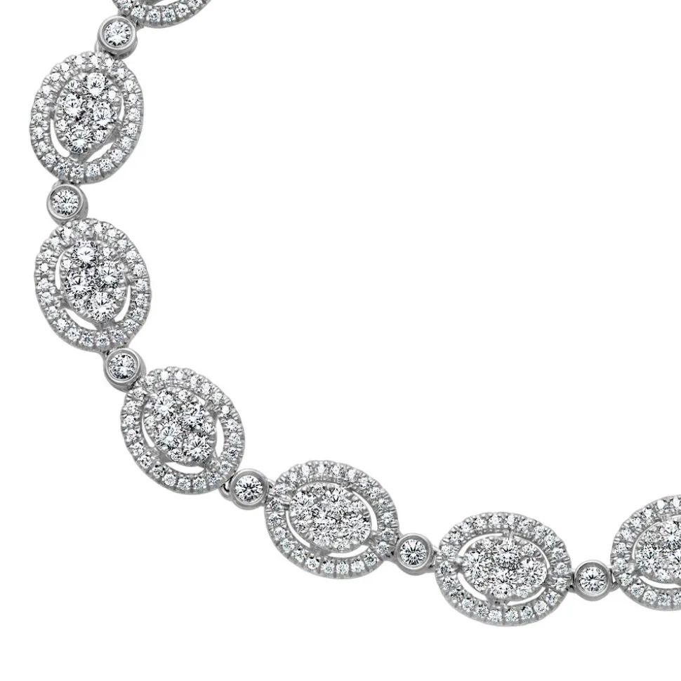 Ein funkelndes Meisterwerk – das ist dieses Diamantarmband für Damen. Das Armband im Halo-Stil ist aus mehreren ovalen Schmuckelementen gefertigt, die abwechselnd mit Diamanten in Zargenfassungen angeordnet sind. Die ovalen Schmuckelemente werden von vier großen und vier kleinen Diamanten geziert und sind jeweils von einem Kranz aus kleinen Diamanten umgeben. Bei den insgesamt 495 Diamanten handelt es sich ausschließlich um lab-grown Diamanten. Diese wurden im Labor hergestellt, unterscheiden sich jedoch in ihrer Härte, der Qualität und ihrem Strahlen nicht von natürlichen Diamanten. Die Labordiamanten besitzen allesamt einen Brillantschliff, der ihr strahlendes Funkeln optimal zur Geltung bringt. Ihre Gesamtkaratzahl beträgt ca. 2,81 ct. und die Farbe der Steine ist klassifiziert als „River“ bis „Top Wesselton“. Bei der Reinheit fallen die lab-grown Diamanten in die Kategorien VVS-VS („very very small inclusions“ bis „very small inclusions“). Die Armkette ist entweder in Weißgold (14 Karat oder 18 Karat) oder 950er Platin erhältlich. Über die Drop-down-Liste lässt sich die gewünschte Legierung ganz einfach auswählen. Für einen guten Halt am Handgelenk ist das Armband mit einem Sicherheitsverschluss versehen, der sich unauffällig in das Design einreiht.