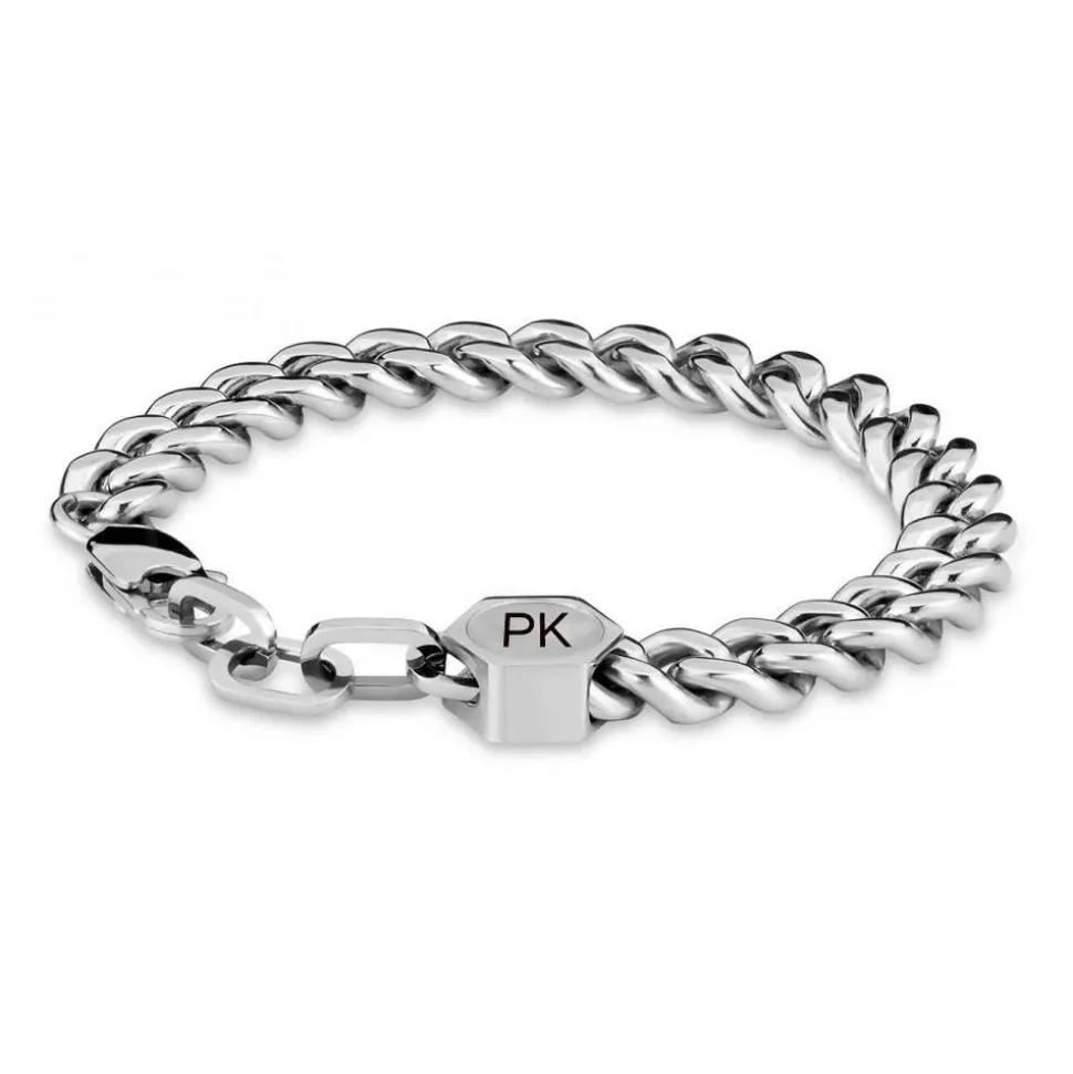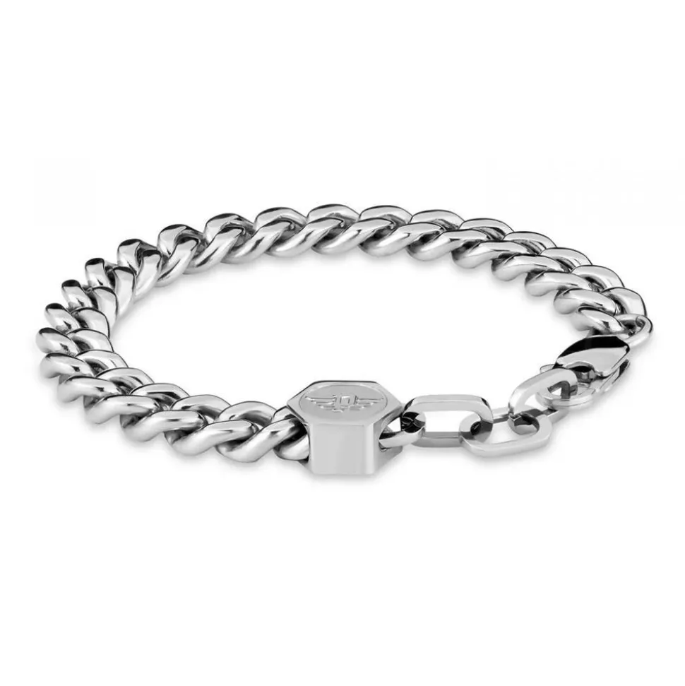 Dieses Panzerarmband für Herren aus Edelstahl ist ein markanter Blickfang! An einem Ende der Panzerkettengliederung befindet sich ein sechseckiges Schmuckelement, welches auf einer Seite vom Markenlogo geziert wird und auf der anderen Seite graviert werden kann. Geschlossen wird das Armband mit einem Karabinerverschluss.