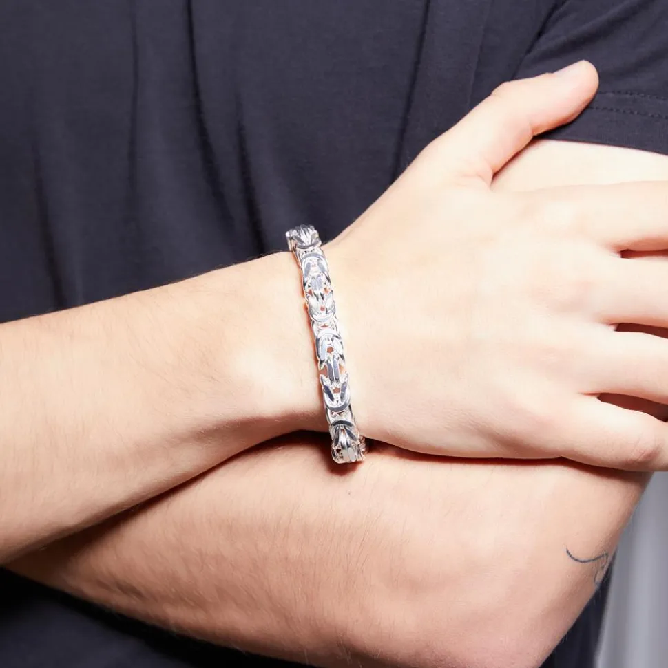 Ein absoluter Blickfang – das ist dieses Armband für Herren aus 925er Silber. Aufgrund der hohen Nachfrage, haben wir es ermöglicht – neben der Premium-Variante – hiermit auch eine preisgünstigere und dennoch qualitativ hochwertige Alternative zu bieten. Es besitzt Königskettenglieder in Vierkant-Form und hat eine Stärke von 8 mm. Das Armband besitzt einen klassischen Karabinerverschluss und die Endkappen sind verlötet, wodurch – bei dem vorhandenen Gewicht – die Stabilität gewährleistet werden kann. Zudem ist es zu 100 % Handarbeit. Daher kann es aber auch bei Länge, Gewicht und Breite zu einer Abweichung von bis zu 3 % kommen.