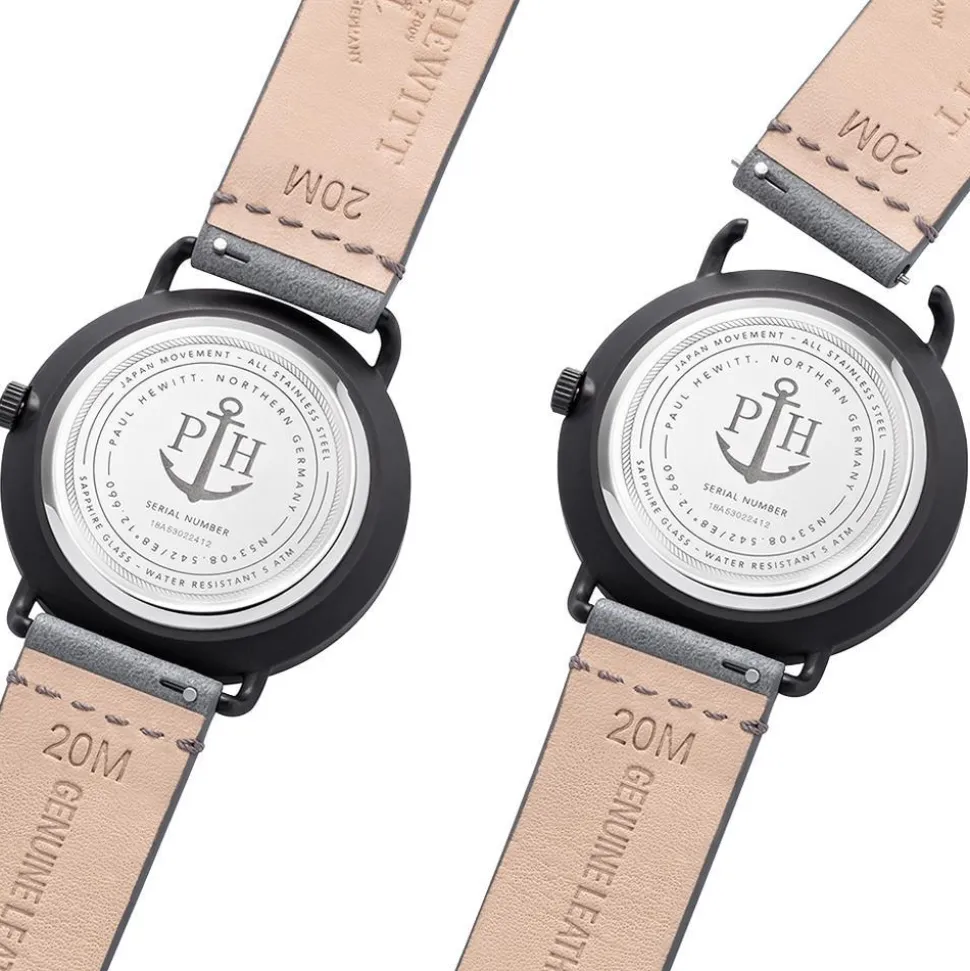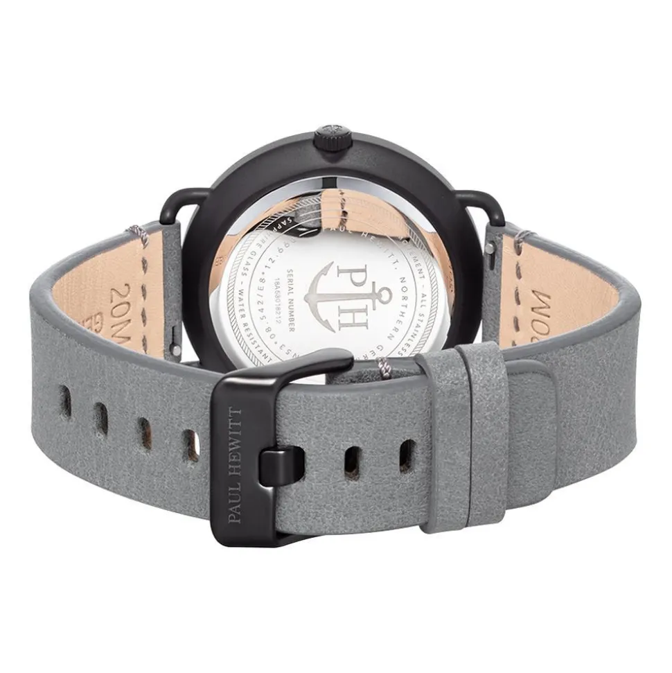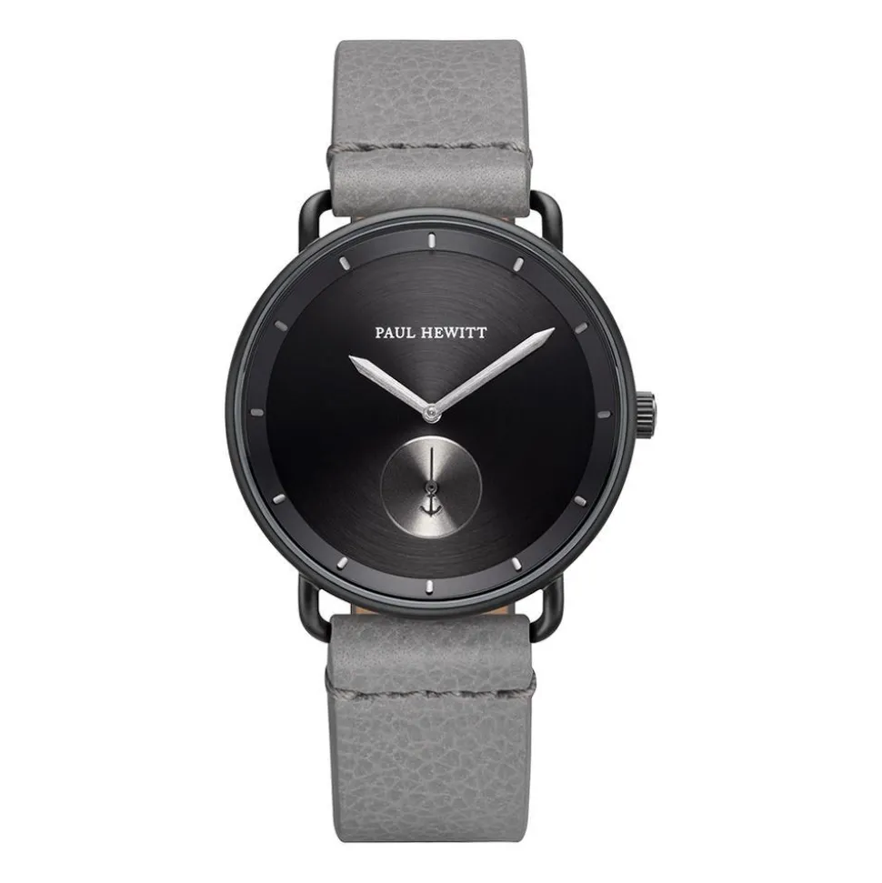 Unaufgeregt modern – das ist diese Uhr für Herren. Das Uhrenband besteht aus grauem Leder und das Uhrengehäuse aus schwarz-beschichtetem Edelstahl. Angetrieben wird sie von einem zuverlässigen Quarzwerk. Das schwarze Zifferblatt befindet sich hinter kratzfestem Saphirglas und ist minimalistisch gehalten. Blickfang ist der Sekundenzeiger, da er die Form eines Ankers besitzt. Geschlossen wird die Armbanduhr mit einer klassischen Dornschließe und sie ist bis zu einem Druck von 5 bar wasserdicht.
