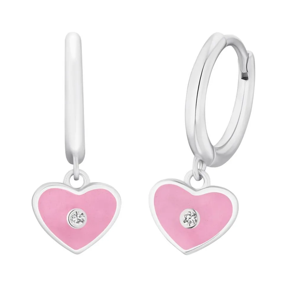 Niedliche Eyecatcher – das sind diese Creolen aus rhodiniertem Steringsilber. Jeder Ohrring besitzt einen Herzanhänger (nicht abnehmbar), welcher mit rosafarbener Emaille beschichtet ist und von einem weißen Zirkonia (synth.) geziert wird.