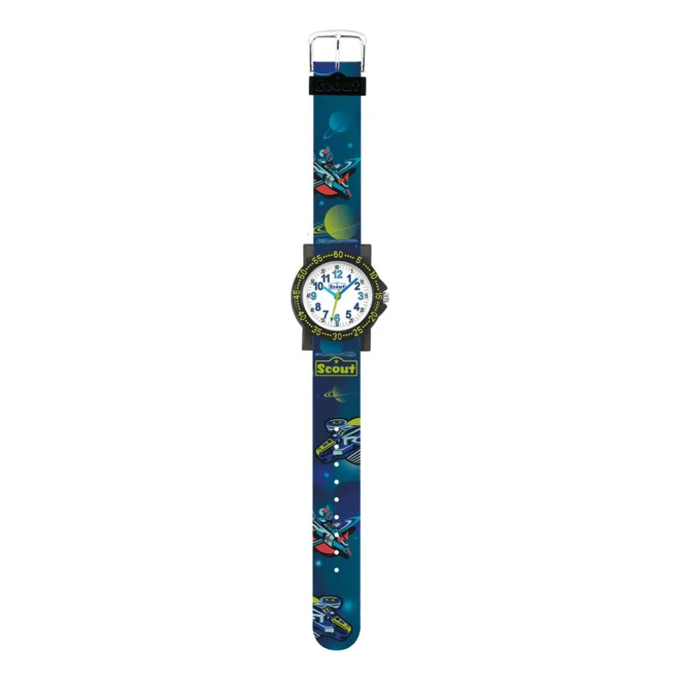 Mit coolen Raumschiffen und entfernten Planeten begeistert diese Kinderuhr. Das Gehäuse ist aus transparentem, schwarzem Kunststoff gefertigt und ist auf der Lünette mit einer grünen Minutenskala versehen. Das weiße Zifferblatt besitzt drei Zeiger sowie eine Stunden- und Minutenskala. Ein echter Blickfang sind die Original Scout Ranzenmotive aus der Serie „Planets“, die sich auf dem weichen Textilband mit Dornschließe befinden. Wasserdicht ist die Uhr bis zu einem Druck von 5 bar.