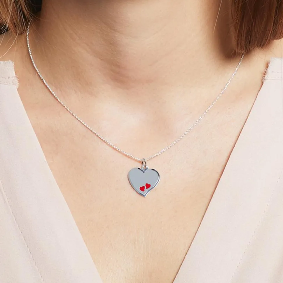 Diese ansprechende Kette mit einem Anhänger im Herzdesign zaubert sicher jeder Frau ein Lächeln ins Gesicht. Sie besteht aus poliertem 925er Sterlingsilber und eignet sich perfekt dazu sie zu verschenken oder aber sich selbst eine Freude zu machen. Das liegt nicht nur an der Herzform und den beiden kleinen Herzen aus roter Emaille, sondern auch daran, dass der Anhänger individualisiert werden kann. Sowohl die Vorder- als auch die Rückseite kann von uns mit einem persönlichen Wunschtext, wie einer Widmung, einem Namen oder Datum graviert werden. Somit entsteht ein ganz individuelles und einzigartiges Schmuckstück.