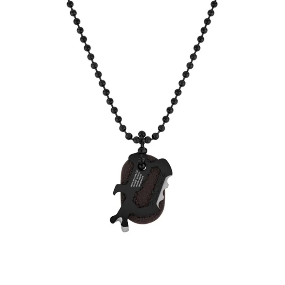Lässig und funktional zugleich – das ist diese Kugelkette für Herren aus schwarz-beschichtetem Edelstahl. Sie besitzt zwei Anhänger: einen Anhänger aus braunem Leder, welcher beidseitig graviert werden kann und einen Anhänger aus schwarzem Edelstahl. Dieser kann zudem als Werkzeug benutzt werden und vereint einen Flaschenöffner, einen Schraubendreher, einen Maulschlüssel, ein kleines Stemmeisen und einen Nagelzieher in sich.