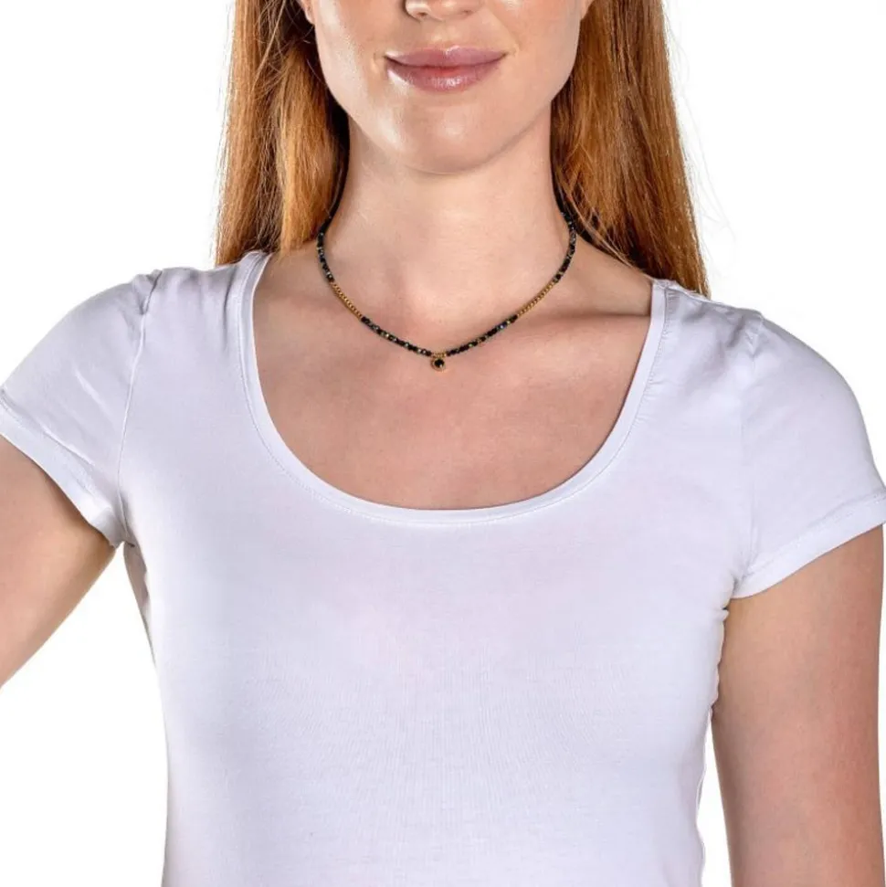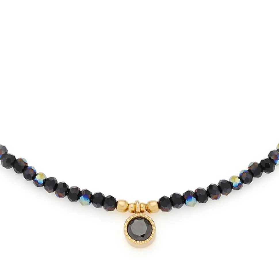 Wirkungsvoll und zugleich filigran – das ist diese Damenkette. Sie besteht aus Edelstahl, welcher eine IP Gold-Beschichtung besitzt. Zudem wird die Kette von gelüsterten Glasperlen geziert und als Anhänger fungiert ein schwarzer Glaskristall in runder Zargenfassung. Die Halskette besitzt einen Karabiner als Verschluss und kann in der Länge angepasst werden.