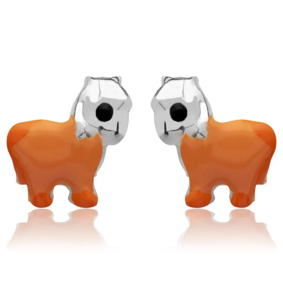 Orange Kinderohrstecker mit Pferdemotiv. Die Ohrstecker sind aus echtem 925 Sterling Silber.
