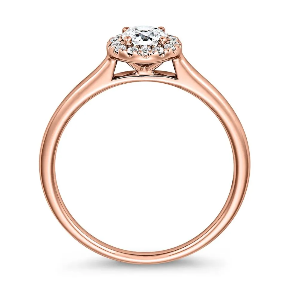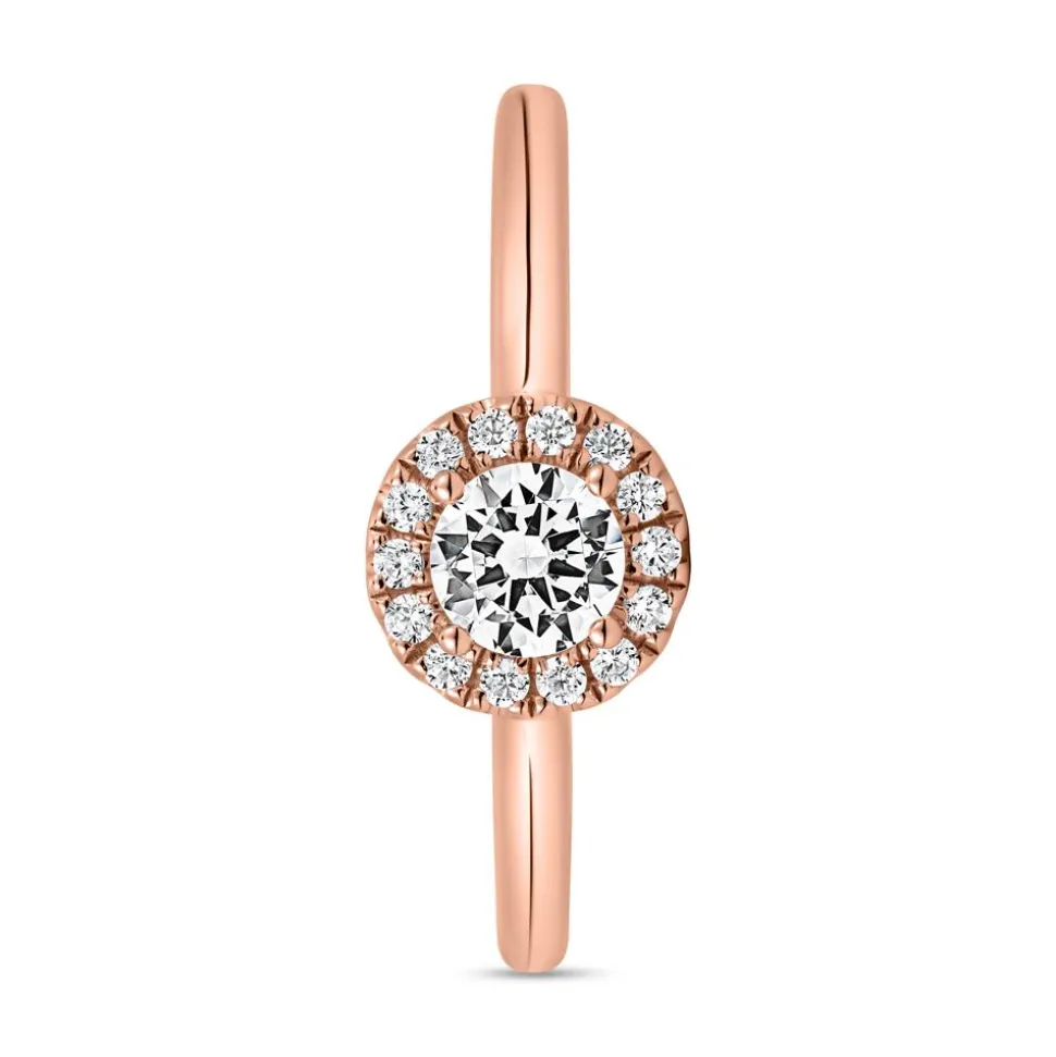 Ein wunderschönes Design macht diesen Verlobungsring aus Roségold aus. Er ist entweder aus 14-karätigem oder aus 18-karätigem Roségold gefertigt, das über das Drop-down-Menü ausgesucht werden kann. Blickfang des Rings ist der brillantgeschliffene lab-grown Diamant mit ca. 0,30 ct., der von einem Kranz aus 14 weiteren lab-grown Diamanten umgeben ist. Dadurch wird das traumhafte Funkeln des Diamanten noch verstärkt. Die 14 Diamanten mit insgesamt ca. 0,10 ct. stammen wie der Centerstone aus dem Labor und weisen eine hervorragende Farbe (D-F) und Reinheit (VVS-VS) auf. Sie bestehen zu 100 % aus Kohlenstoff und besitzen die gleiche Härte und das gleiche Feuer wie natürliche Diamanten. Durch die schmale Ringschiene lässt sich der Ring besonders angenehm tragen.