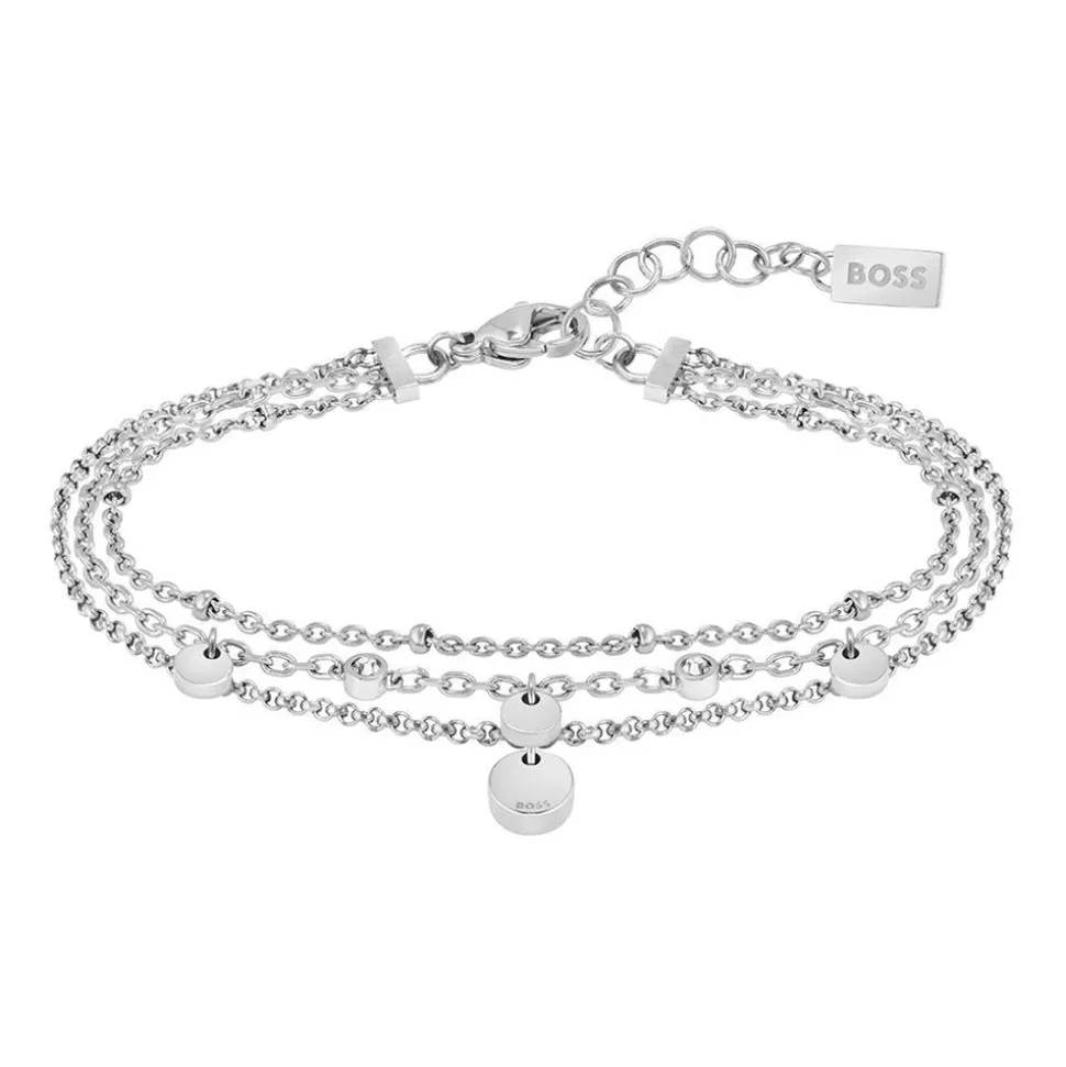Modern und feminin – das ist dieses Armband aus Edelstahl. Die drei Reihen aus Ankerkettengliedern werden von Plättchen-Anhängern, zargengefassten Glassteinen und kleinen Kugeln geziert. Die Armkette wird mit einem Karabiner geschlossen und kann in der Länge reguliert werden.