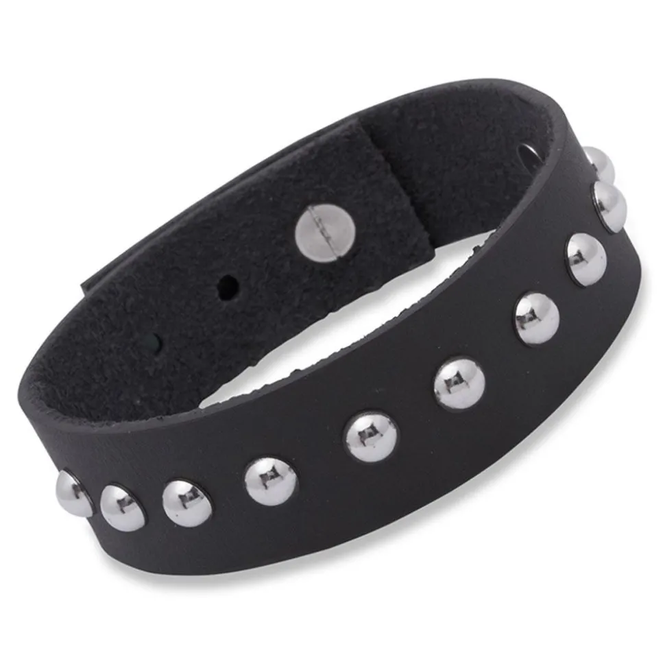 Das rockige Armband aus schwarzem Echtleder ist vollkommen von Edelstahlnieten umgeben. Durch eine Mehrfachlochung kann es in der Länge angepasst werden. Geschlossen wird es mit einem Kugelkopfverschluss. Verstellbar von 18 bis 22 cm.