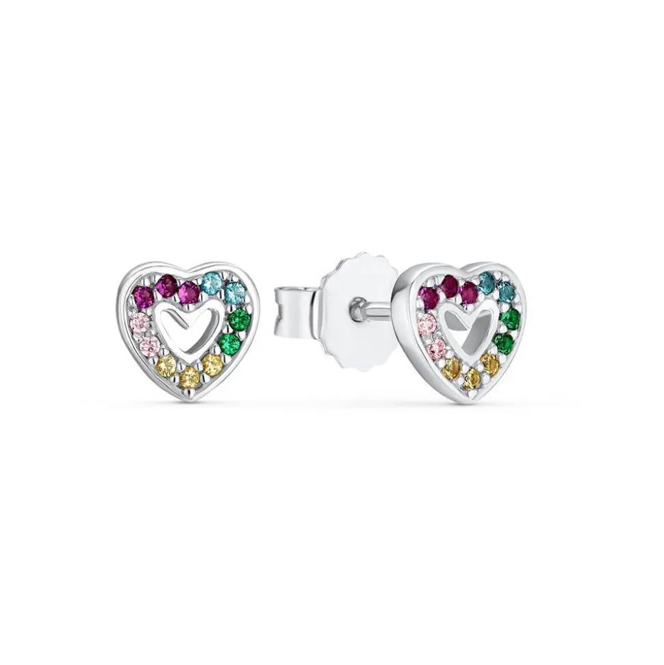 Niedliche Eyecatcher – das sind diese Herzohrstecker für Mädchen. Sie bestehen aus 925er Silber, welches durch die Rhodinierung anlaufgeschützt ist. Jedes der Herzen ist mit Zirkonia in Pink, Hellblau, Grün, Gelb und Hellrosa besetzt – wie ein zauberhafter Regenbogen!