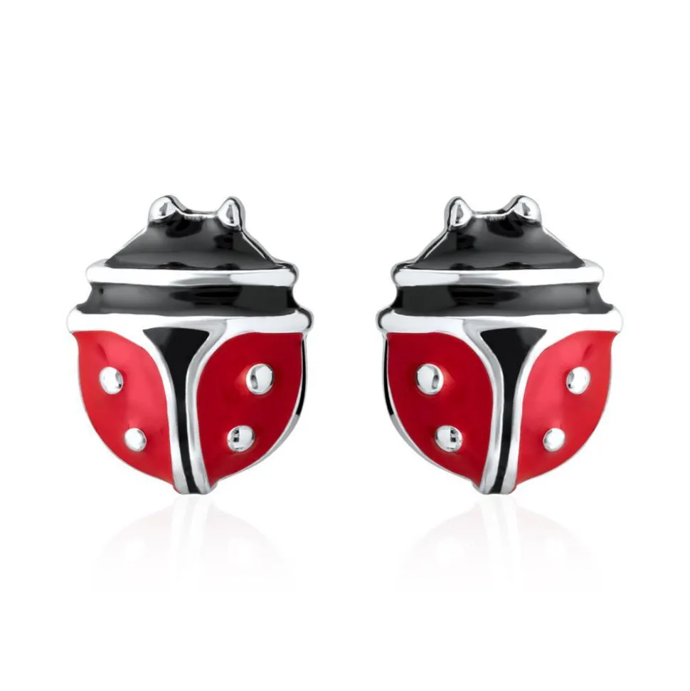 Süße kleine Glücksbringer – das sind diese Ohrstecker für Mädchen. Sie bestehen aus rhodiniertem Sterlingsilber und jeder Stecker besitzt die Form eines Marienkäfers. Diese sind mit roter und schwarzer Emaille akzentuiert.