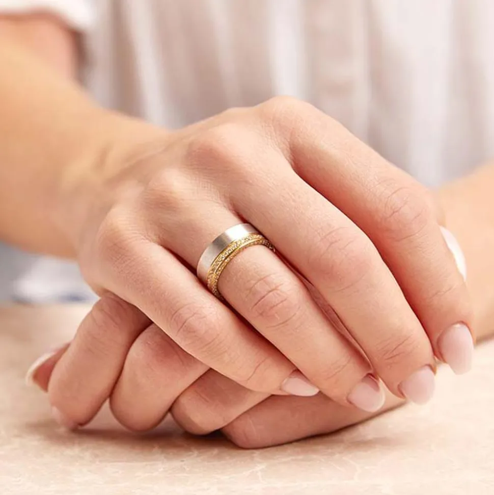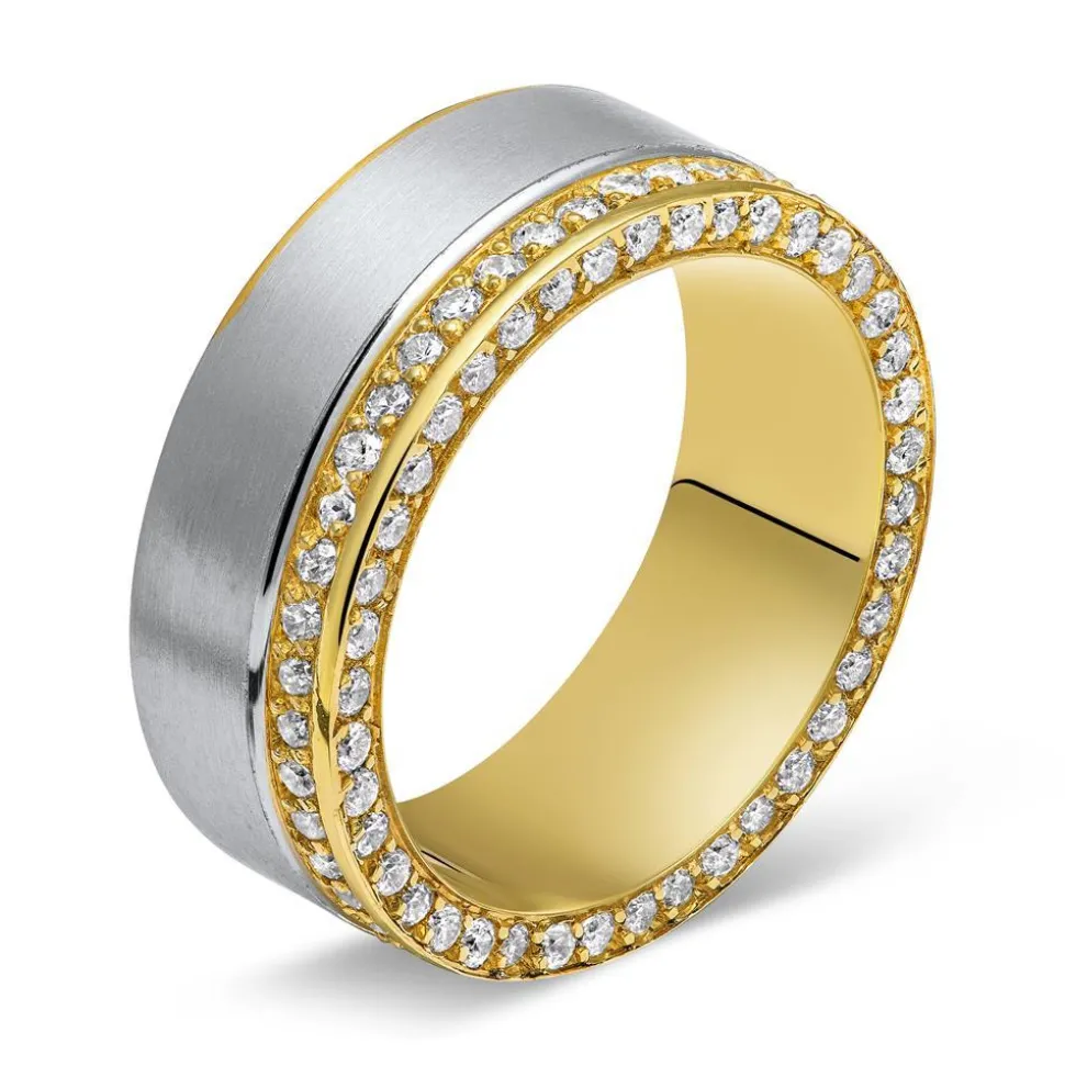 Premium Damenring von Vivo aus echtem 925er Sterlingsilber. Der Silberring besitzt eine teilvergoldete Oberfläche, er ist entlang dieser Oberfläche mit 80 funkelnden Zirkonia besetzt. Dank seiner Rhodinierung ist der Ring anlaufgeschützt. Sie können den Ring mit einer Innen- sowie Außengravur versehen lassen.